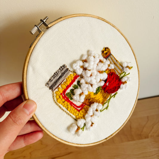 Vintage Creative Circle Stitched Crewel Artwork - Teapot and Popcorn
