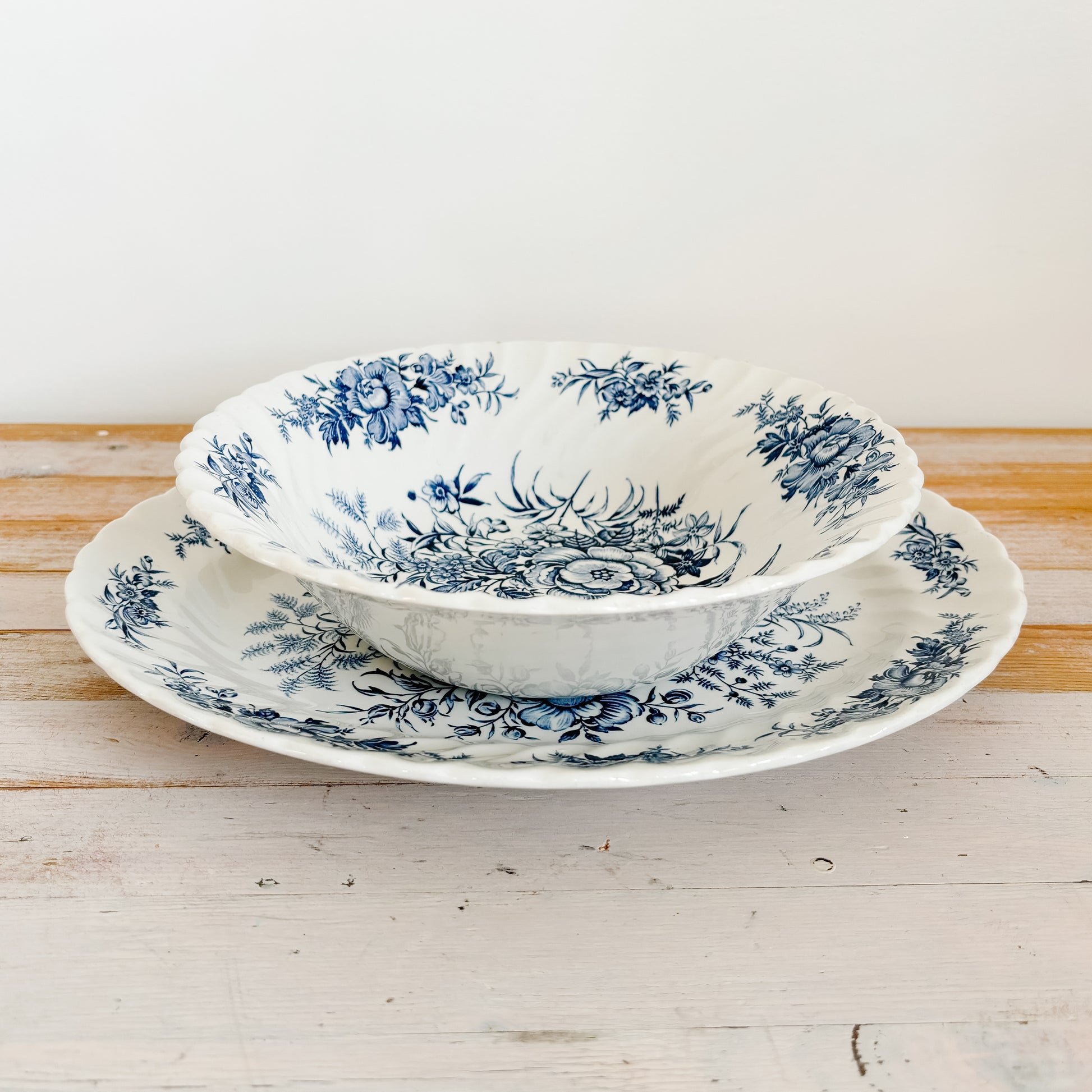 Beautiful ironstone blue floral serving plate and bowl. The pattern is Beacon Hill by British Anchor from Staffordshire, England. Sold as a set.