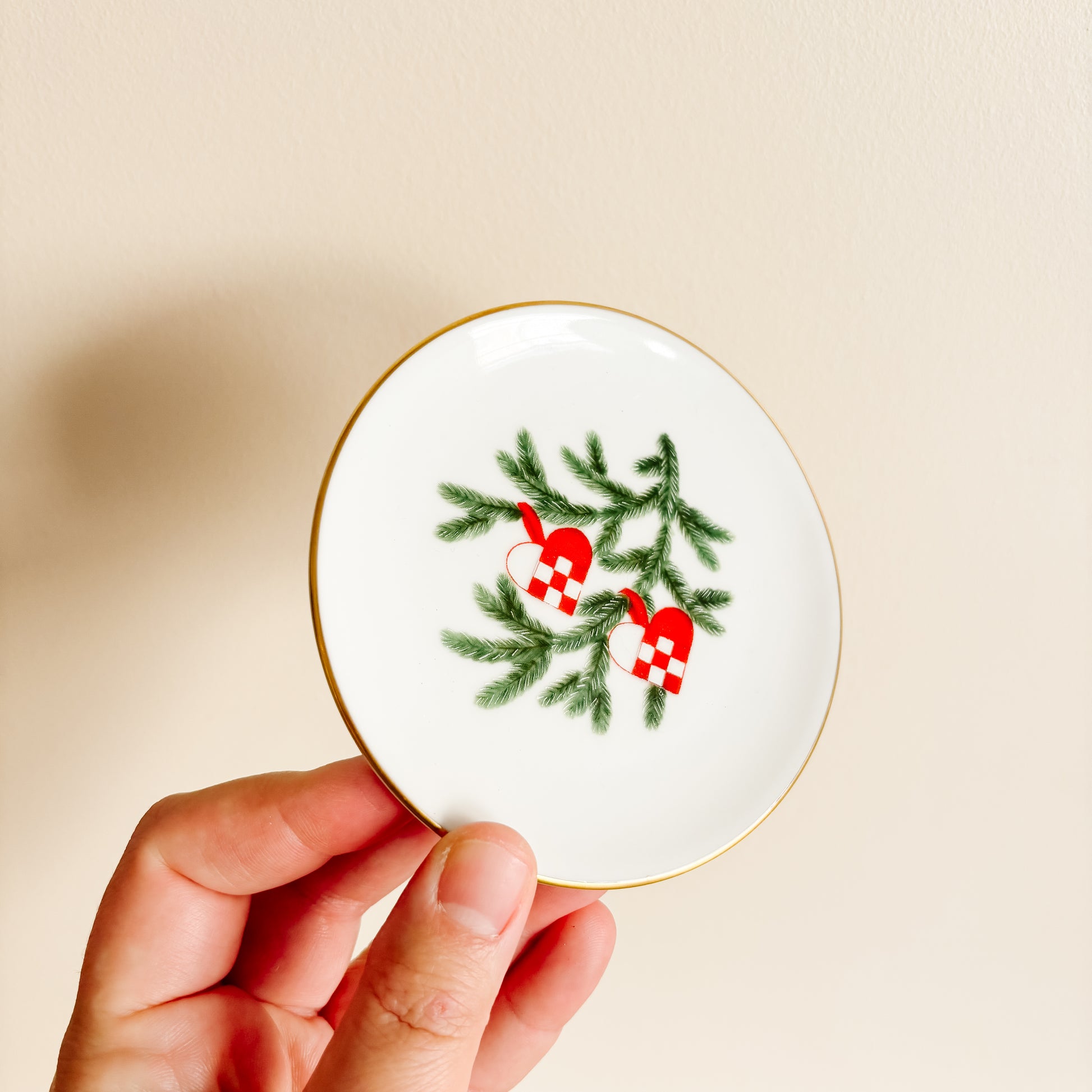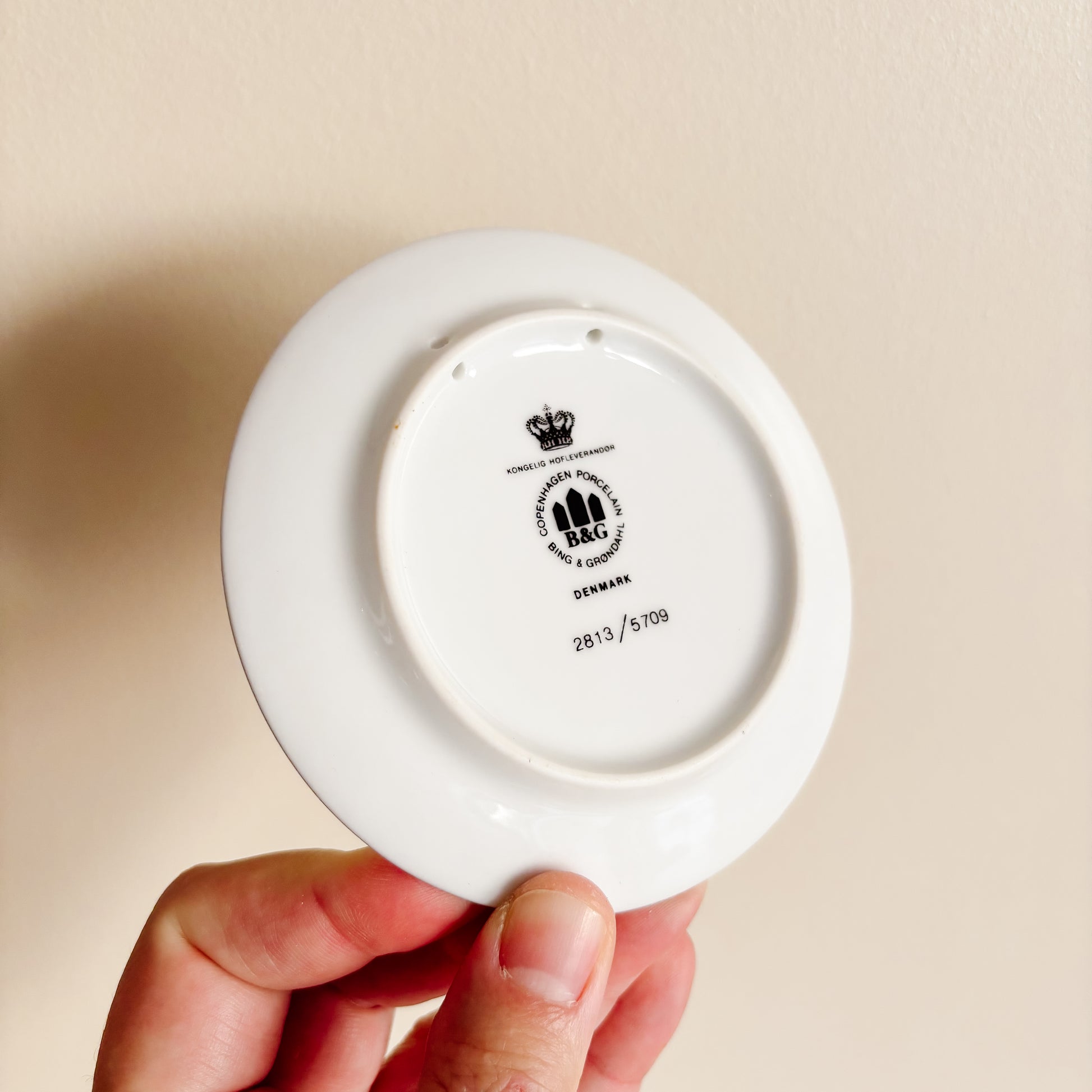 Cute small plate with a festive design, great for rings or a candle! Numbered edition by Bing & Grondahl Denmark. Gold trim on the edge, holes on the back to wire for hanging.