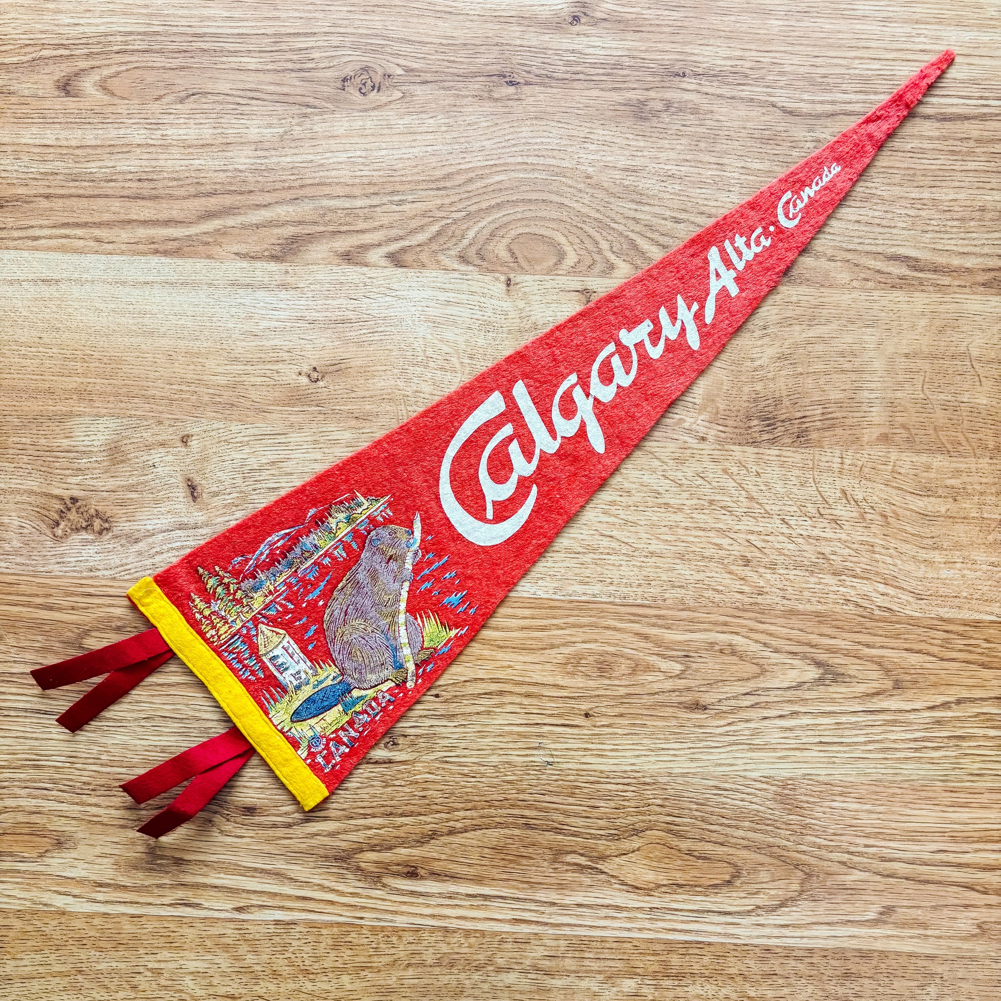 Vintage red felt travel pennant from Calgary, Alberta. Dates back to the 1960s. In great overall condition, see all photos for details.