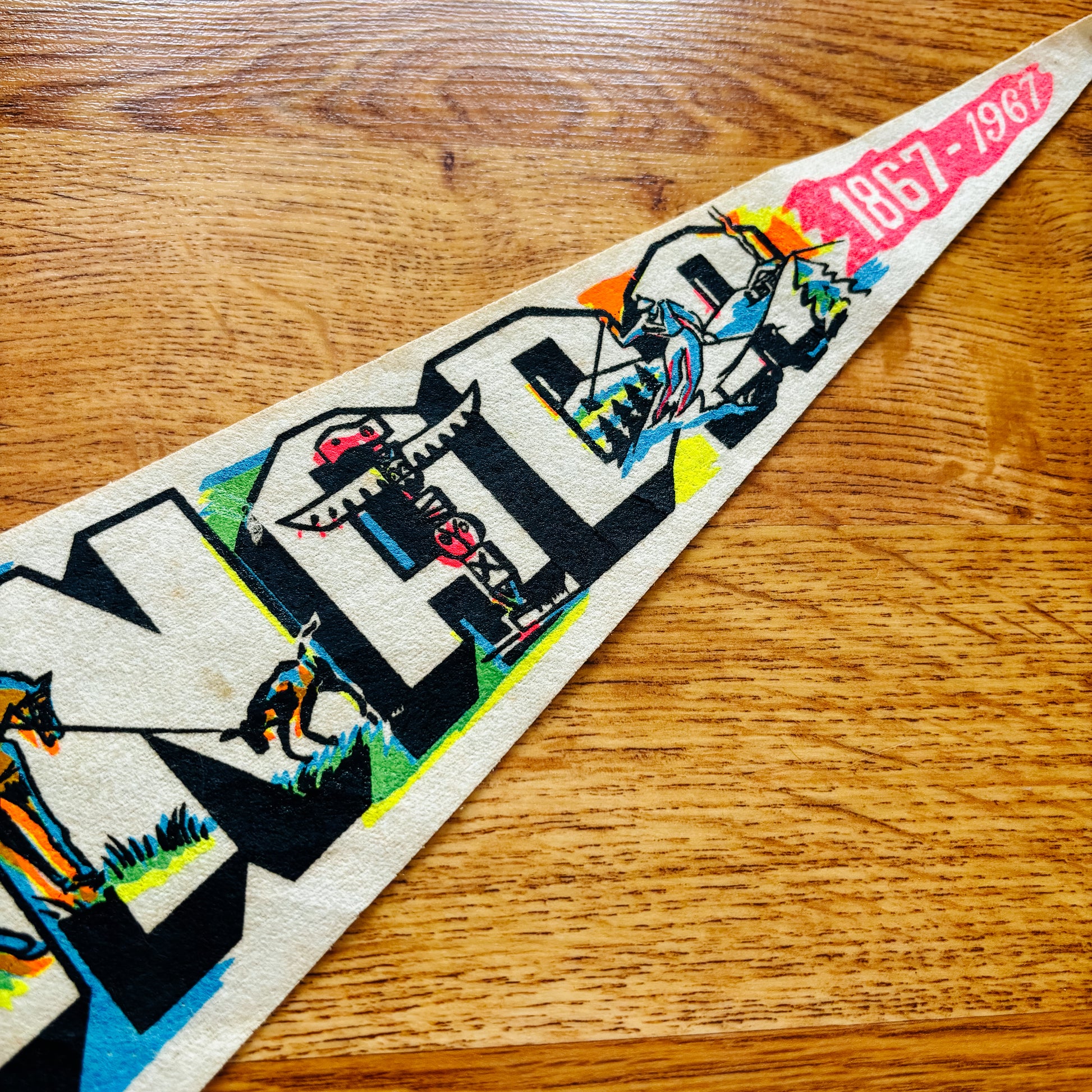Vintage white felt travel pennant celebrating Canada's centennial in 1967. Bright bold colours! Dates back to the 1960s. In great overall condition, see all photos for details.