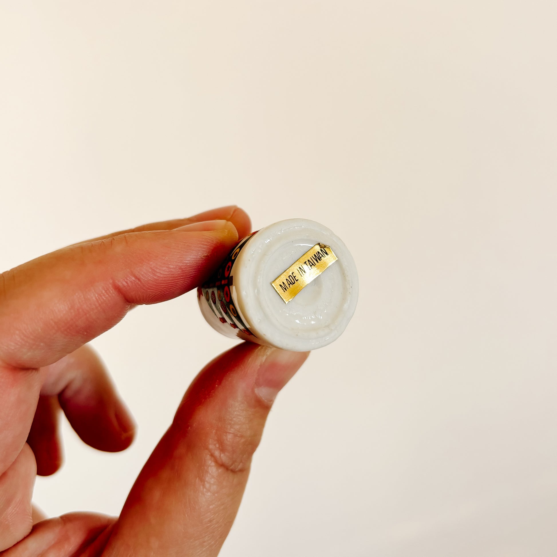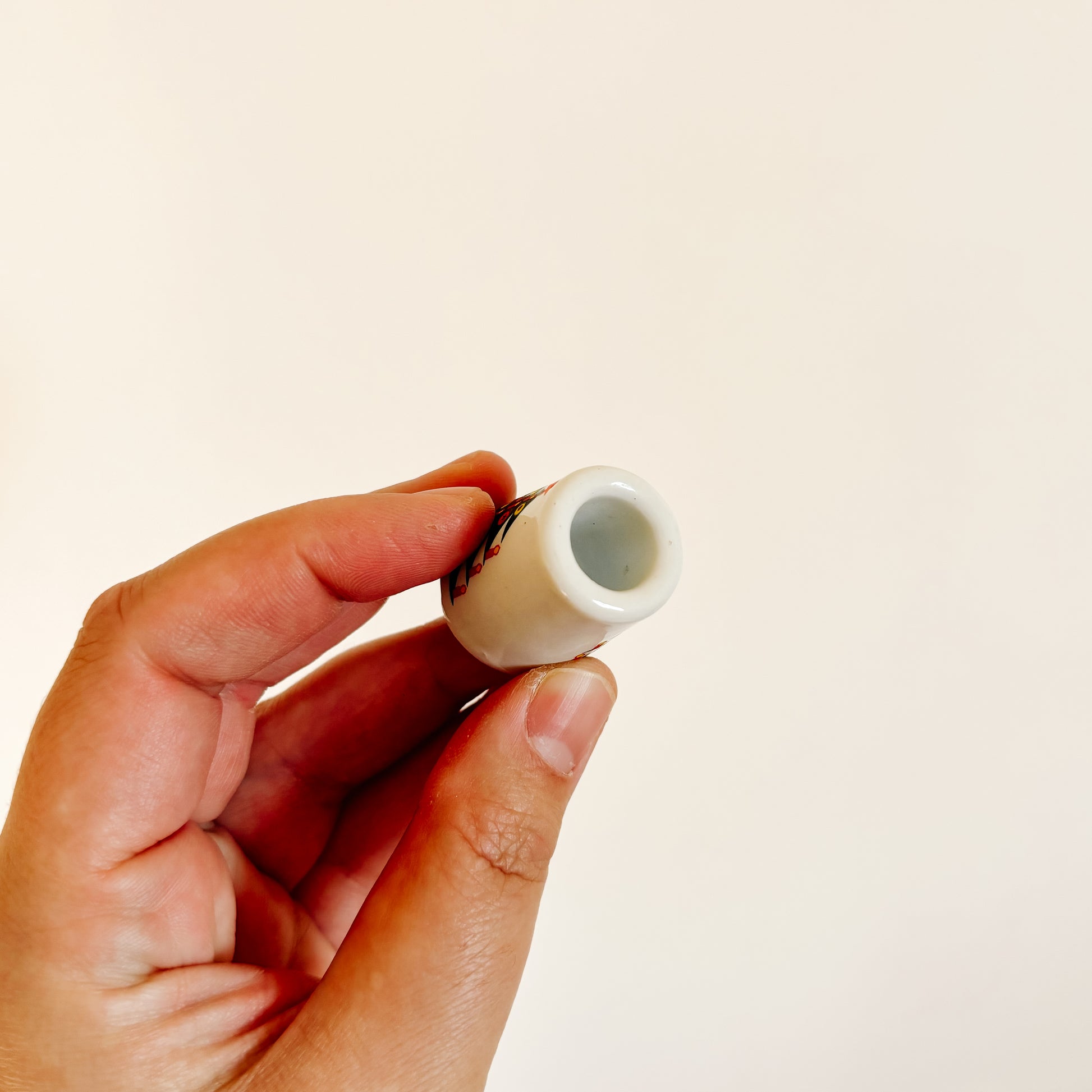 These small ceramic candle holders hold small sized tapers perfectly. I love the retro Christmas tree design on the front. Tag reads made in Taiwan. Sold as a set of 6.