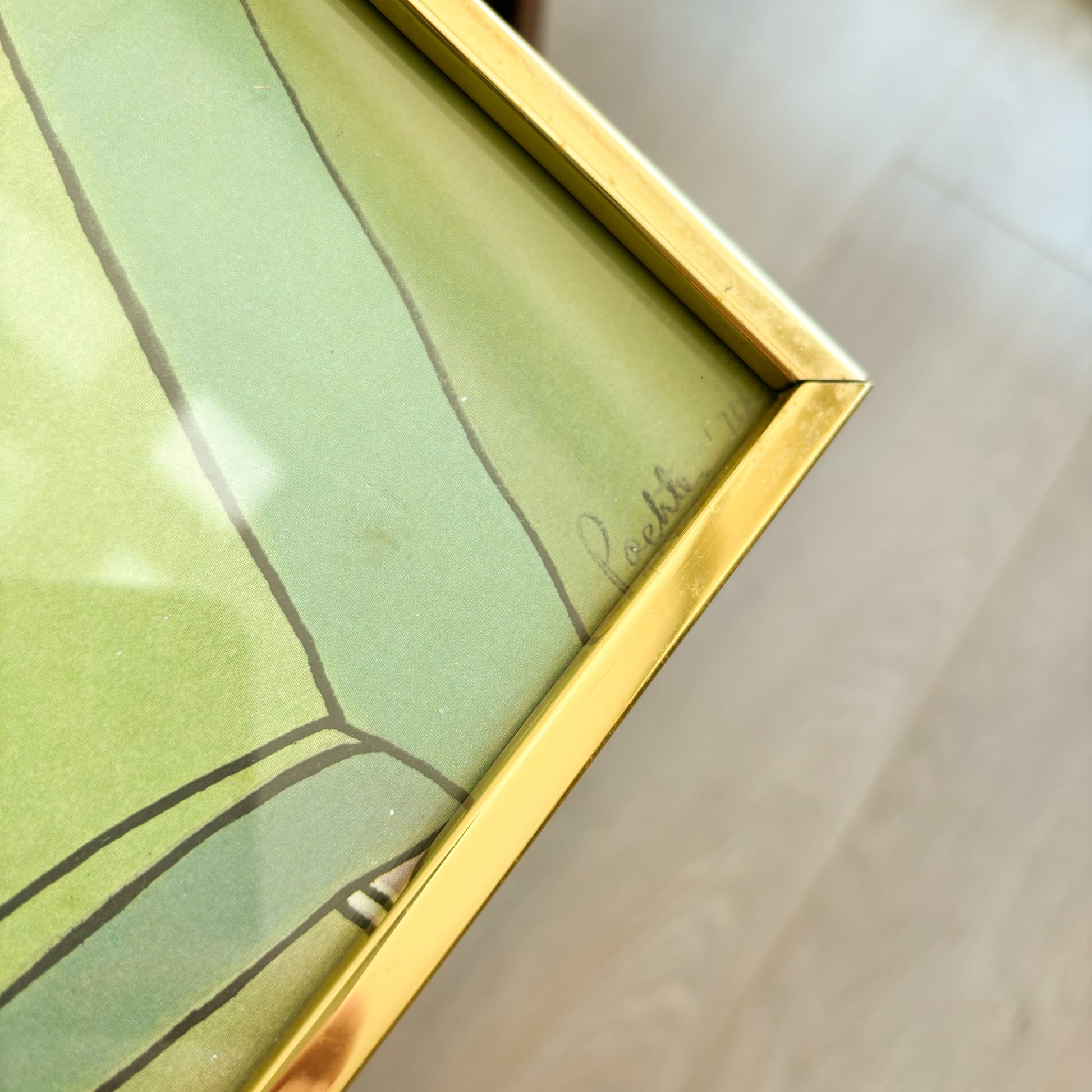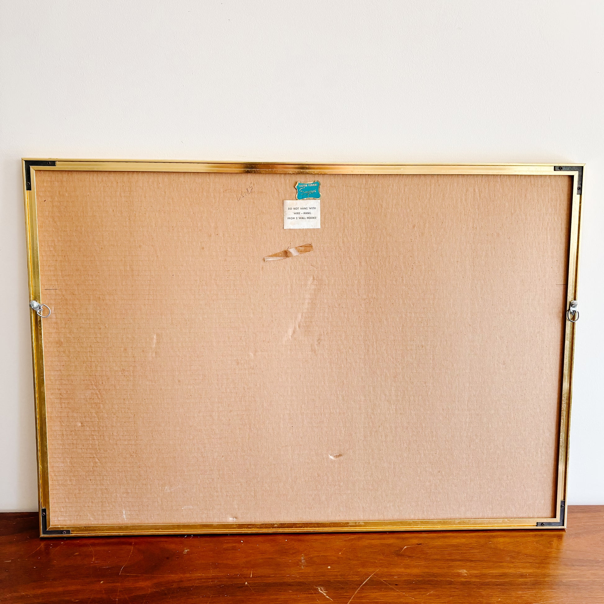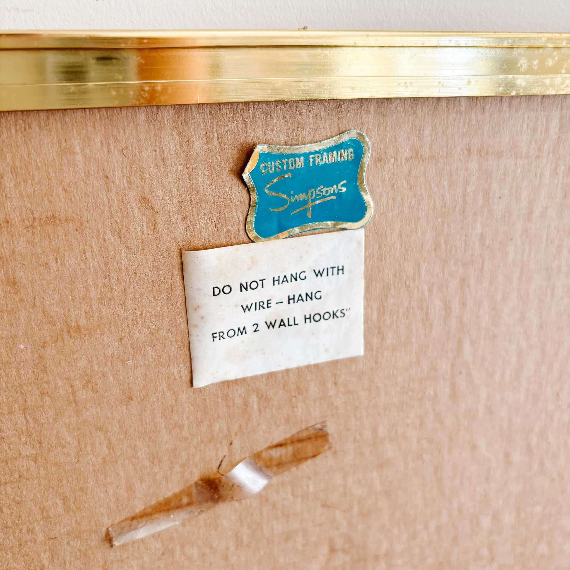 Custom framed at Simpsons department store, brass and glass frame with hooks on back to wire and hang.