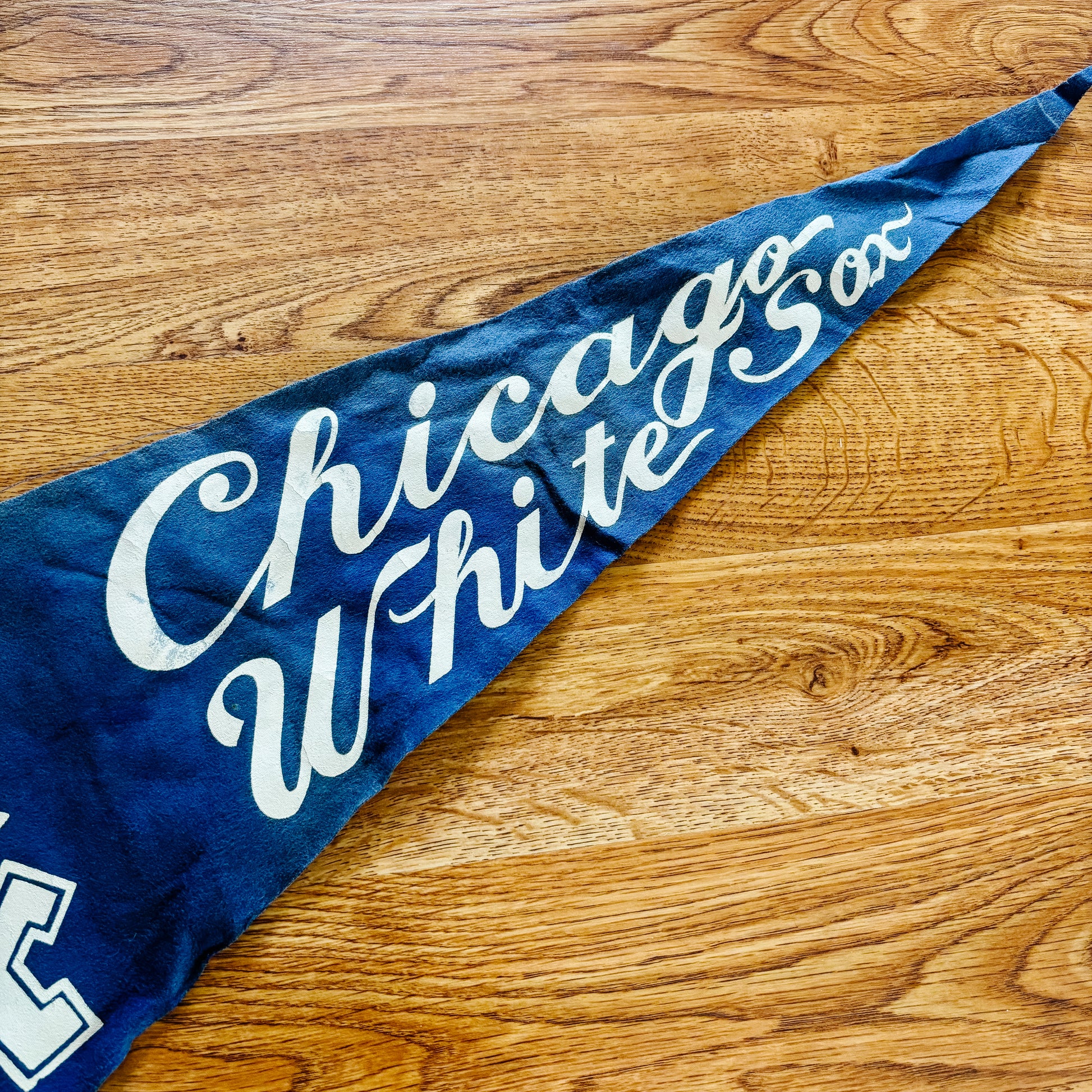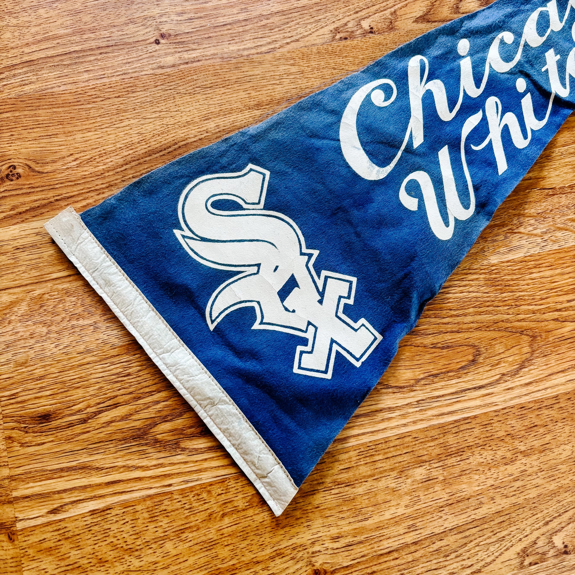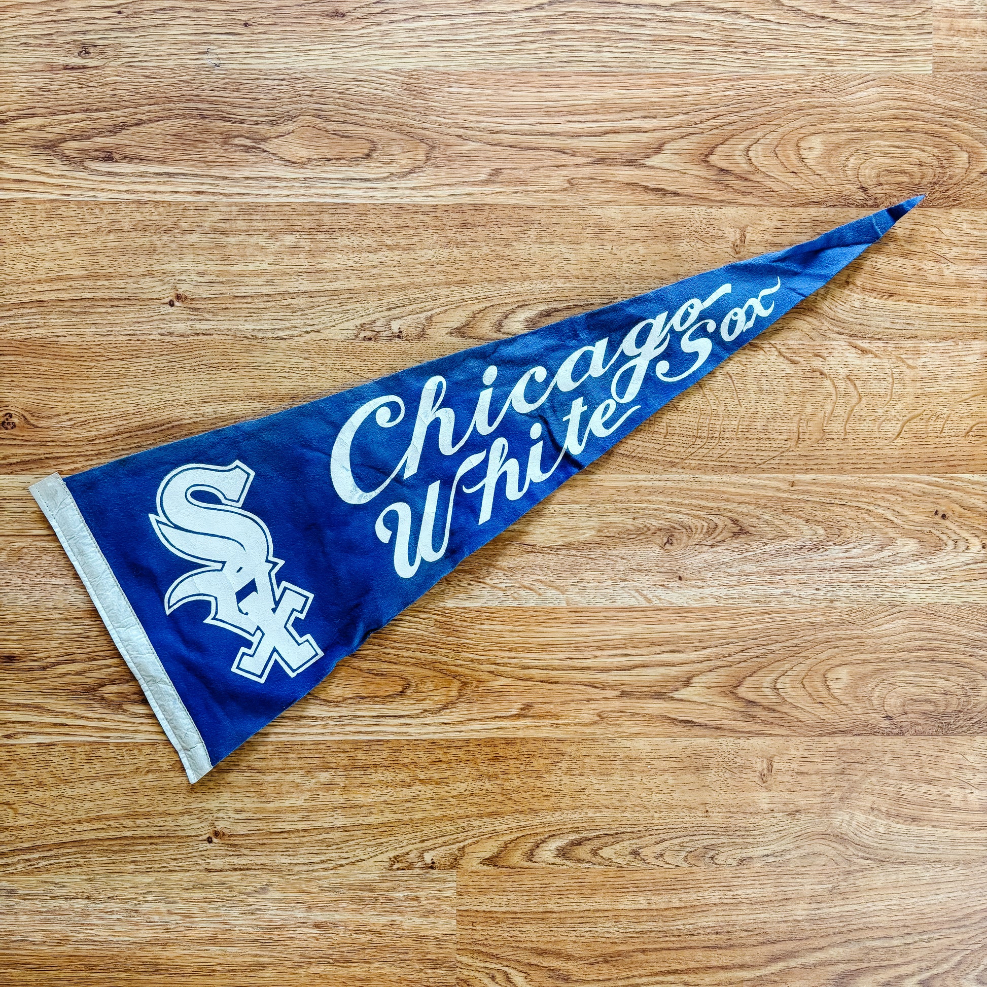 Vintage blue and white felt sports pennant for the Chicago White Sox Major League Baseball team. Dates back to the 1960s. In great overall condition, see all photos for details.