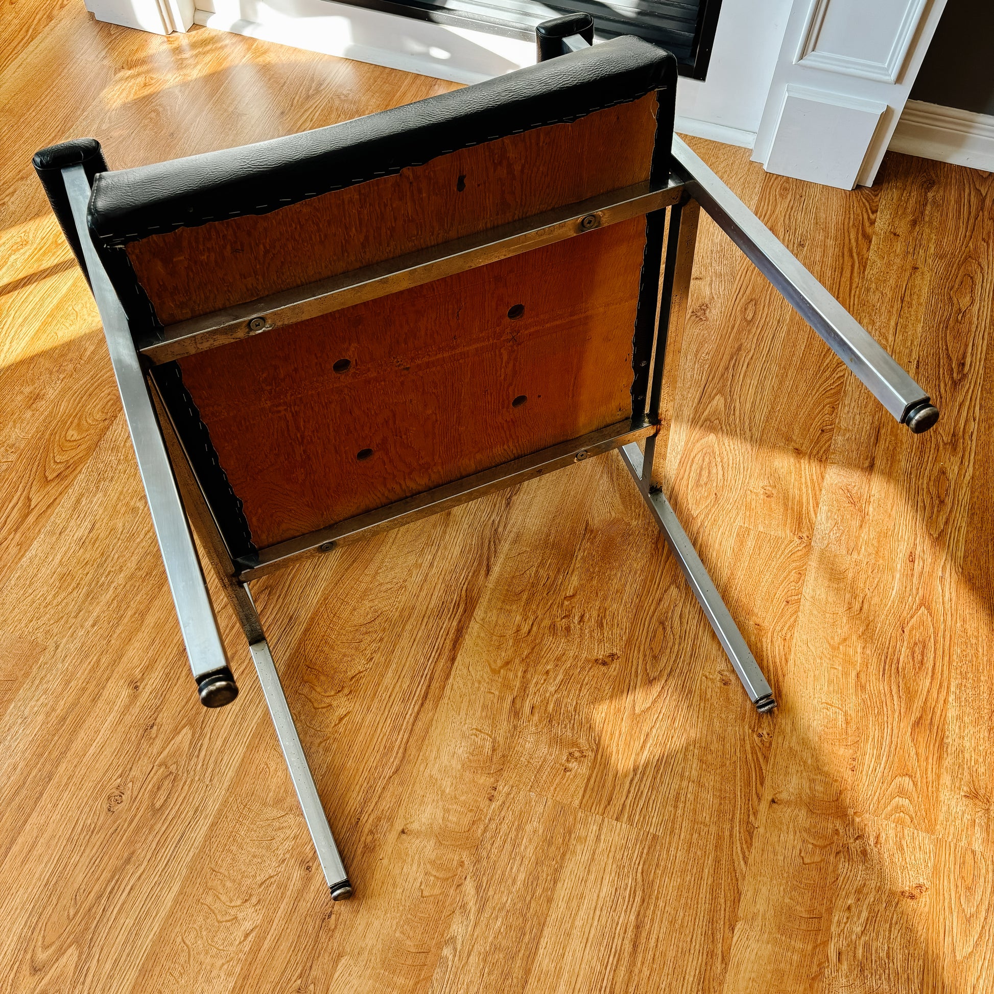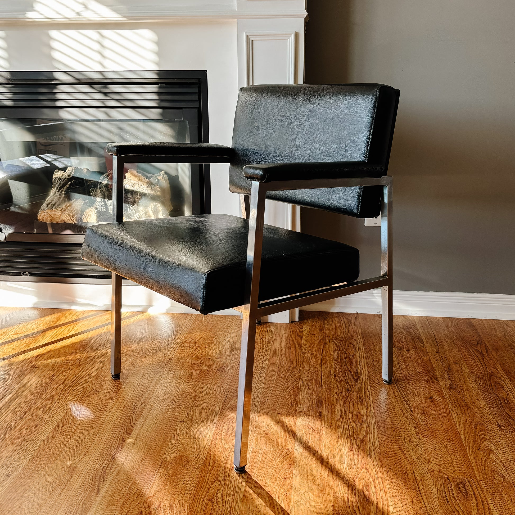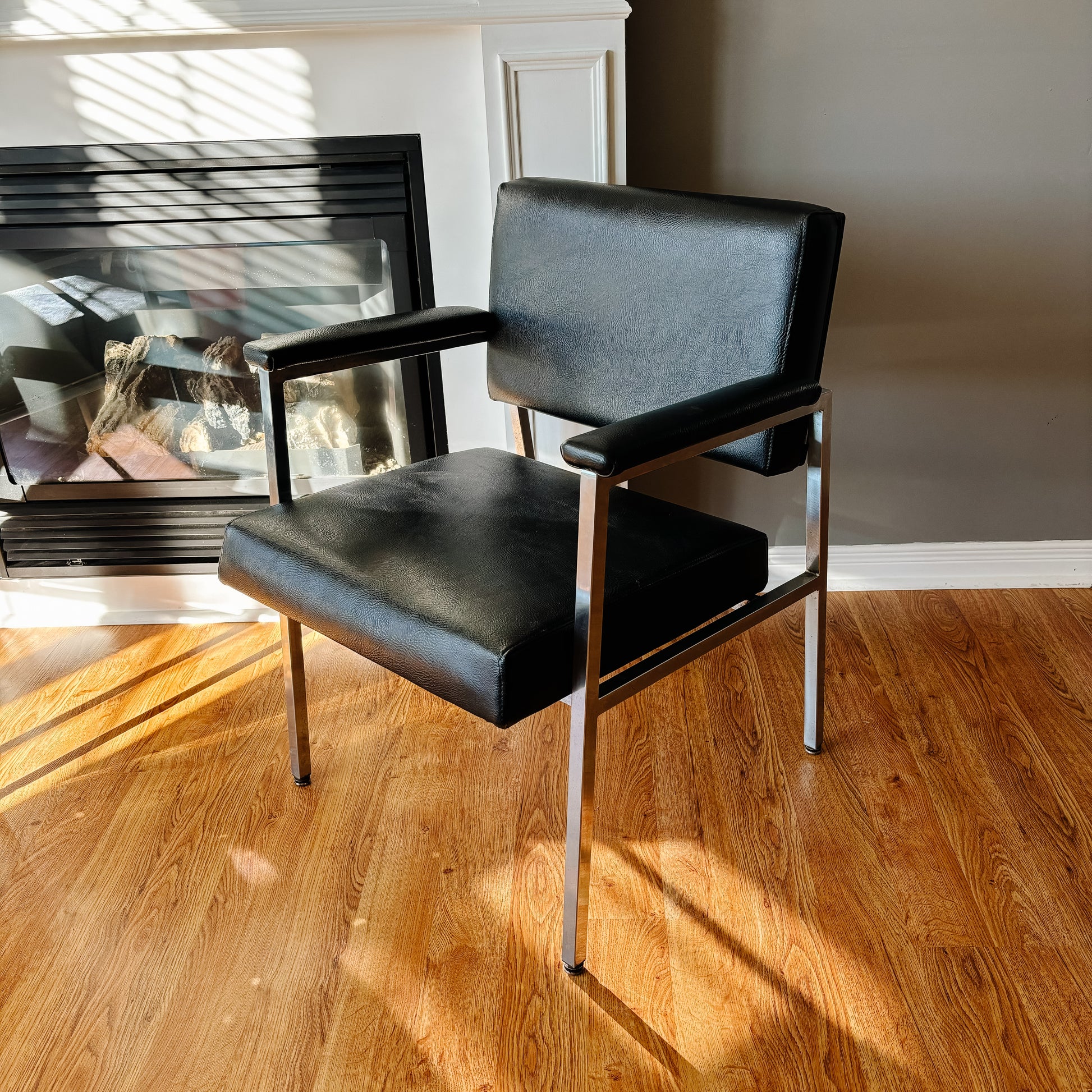These chrome metal armchairs have black vinyl padded seats, back, and arms. Super comfortable to sit in, great modern accent chair for a living room or bedroom. Both chairs are in great condition with no damage or rips. Price is per chair.
