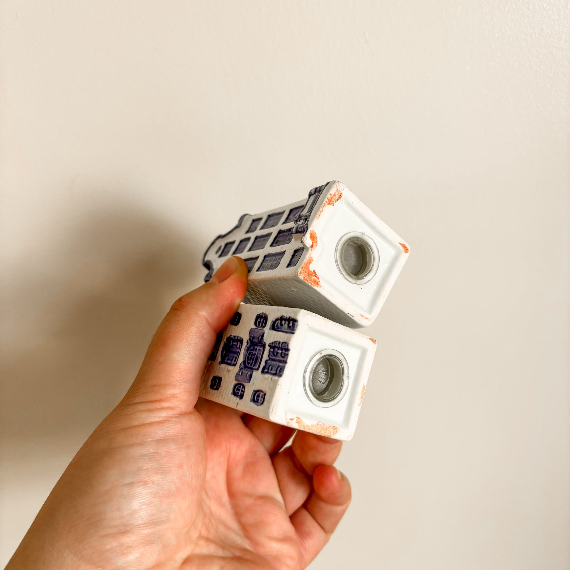 Salt & pepper shaker set featuring Dutch canal houses in blues and white made by Elesva Holland. In great overall condition with stoppers, see all photos.