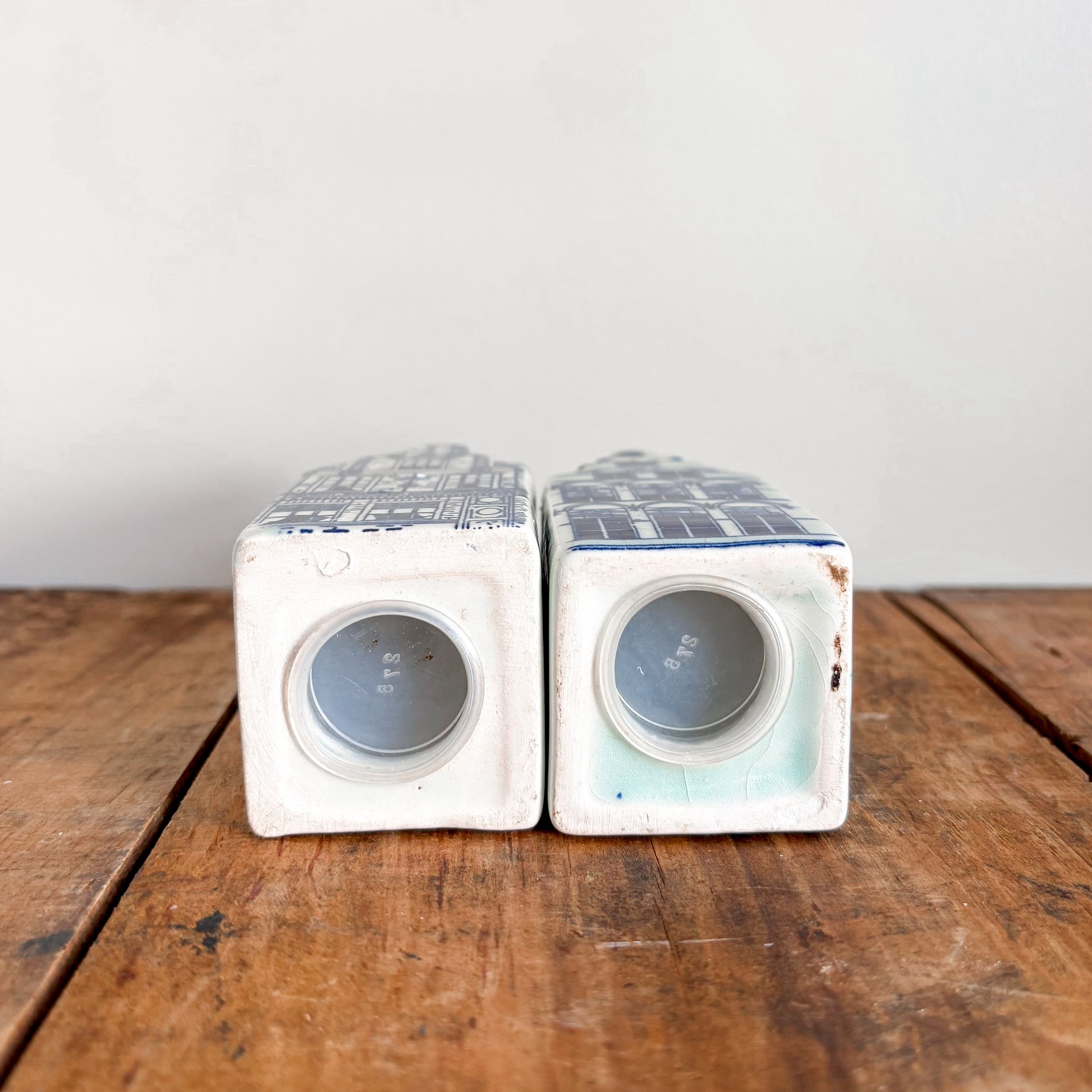 Salt & pepper shaker set featuring Dutch canal houses in blues and white. In great overall condition with stoppers, see all photos.