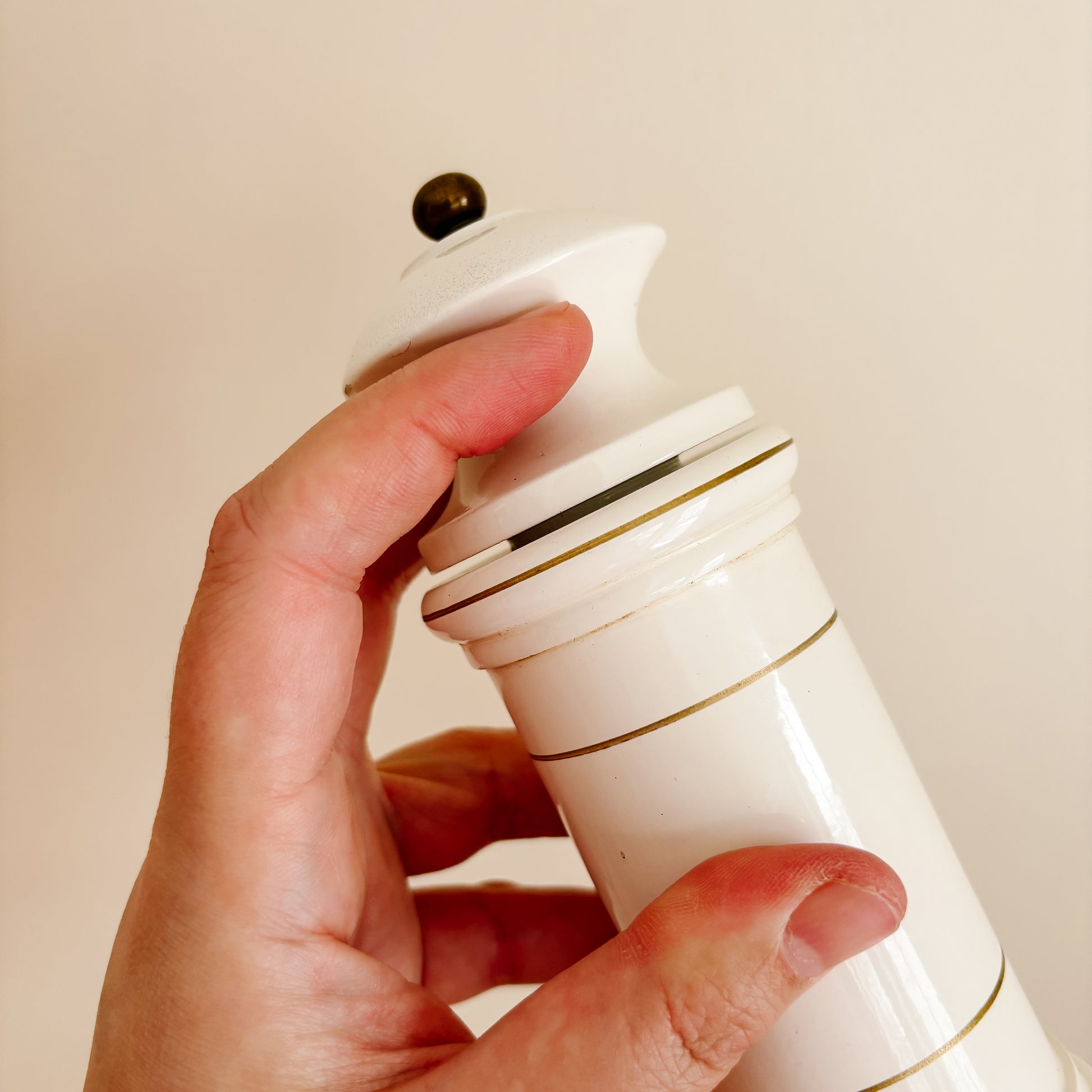 Condition Notes: In working condition with wear due to age and use (these were in my parents' kitchen for many years). Salt grinder has some wiggle room between the top and body, see photo. Sold as-is.