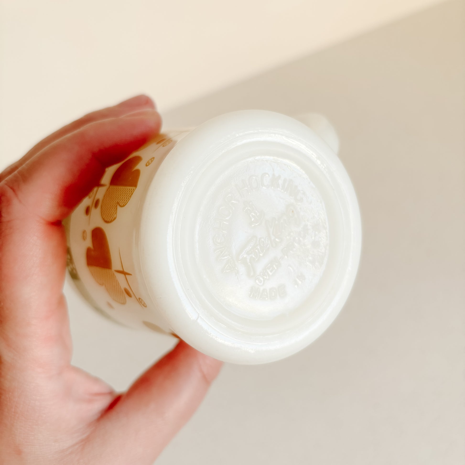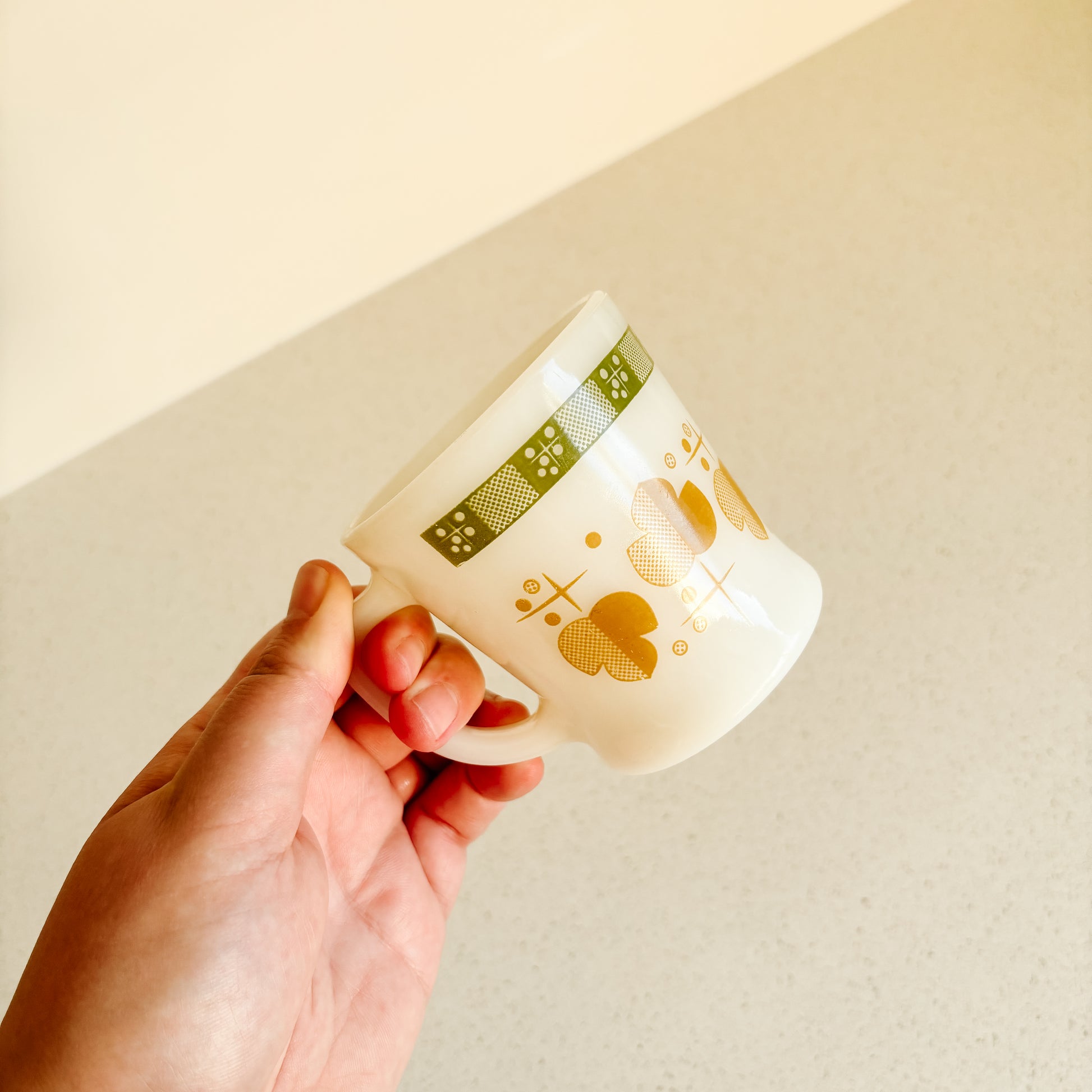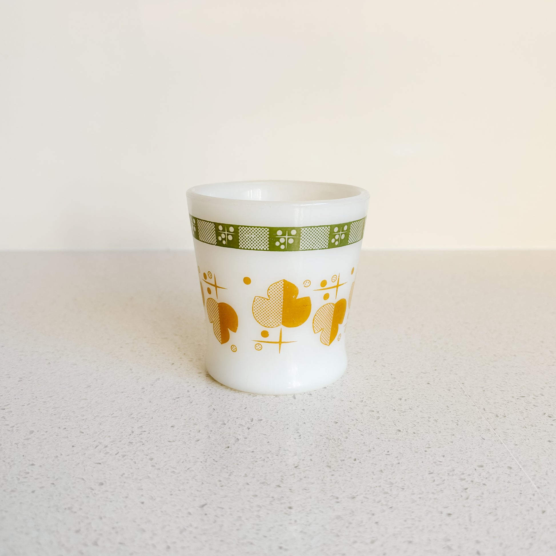 Vintage Fire-King milk glass mug with D-handle. I've seen this pattern called Shamrock, Maple Leaf, Atomic Leaf etc. Take your pick. In perfect condition!