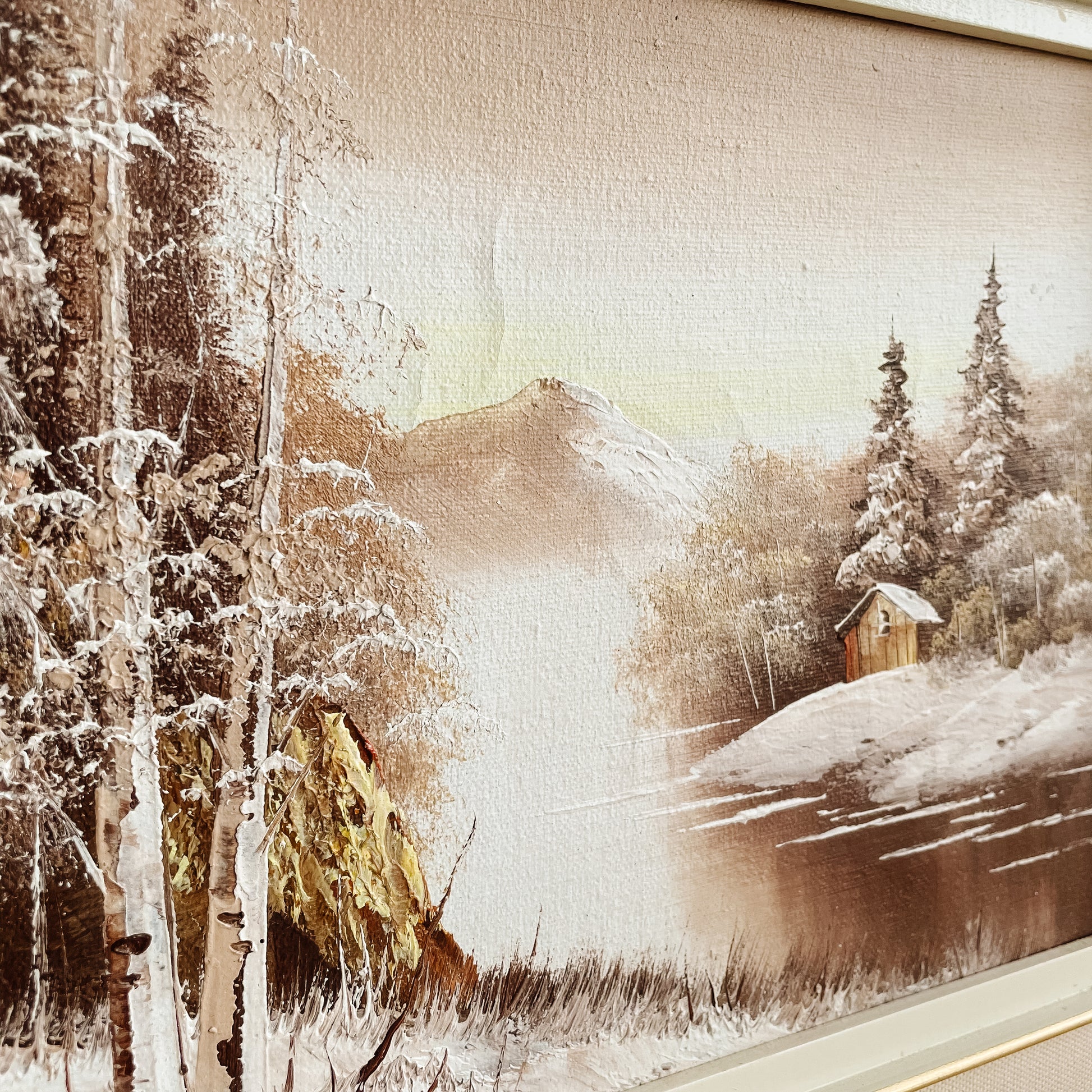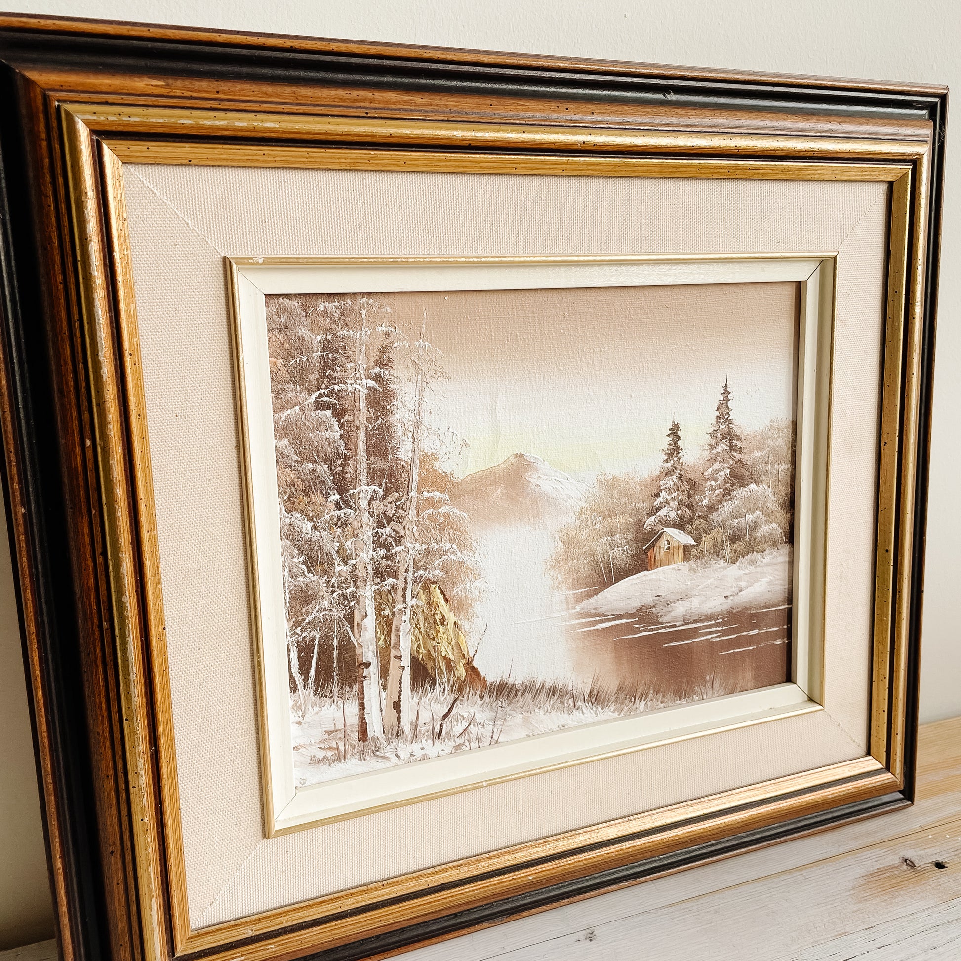 Original oil painting on canvas. Features a serene wintery scene with trees in the foreground and a mountain in the distance. Linen mat and wood/gold frame. No artist's signature, undated.