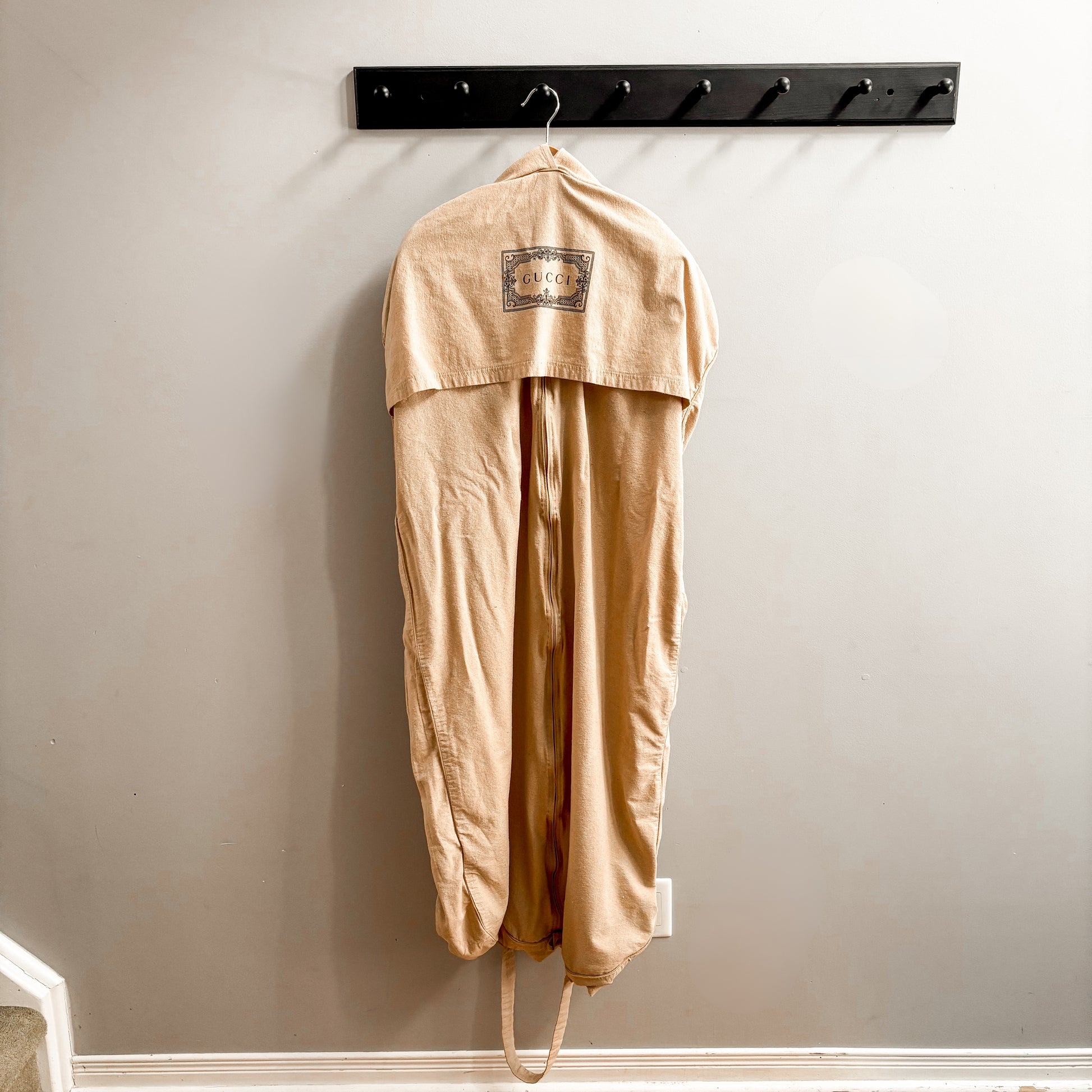 Gucci branded cotton garment bag with zipper and snaps to keep it folded in two. Handles at the top to carry. Great way to carry your clothing in style!