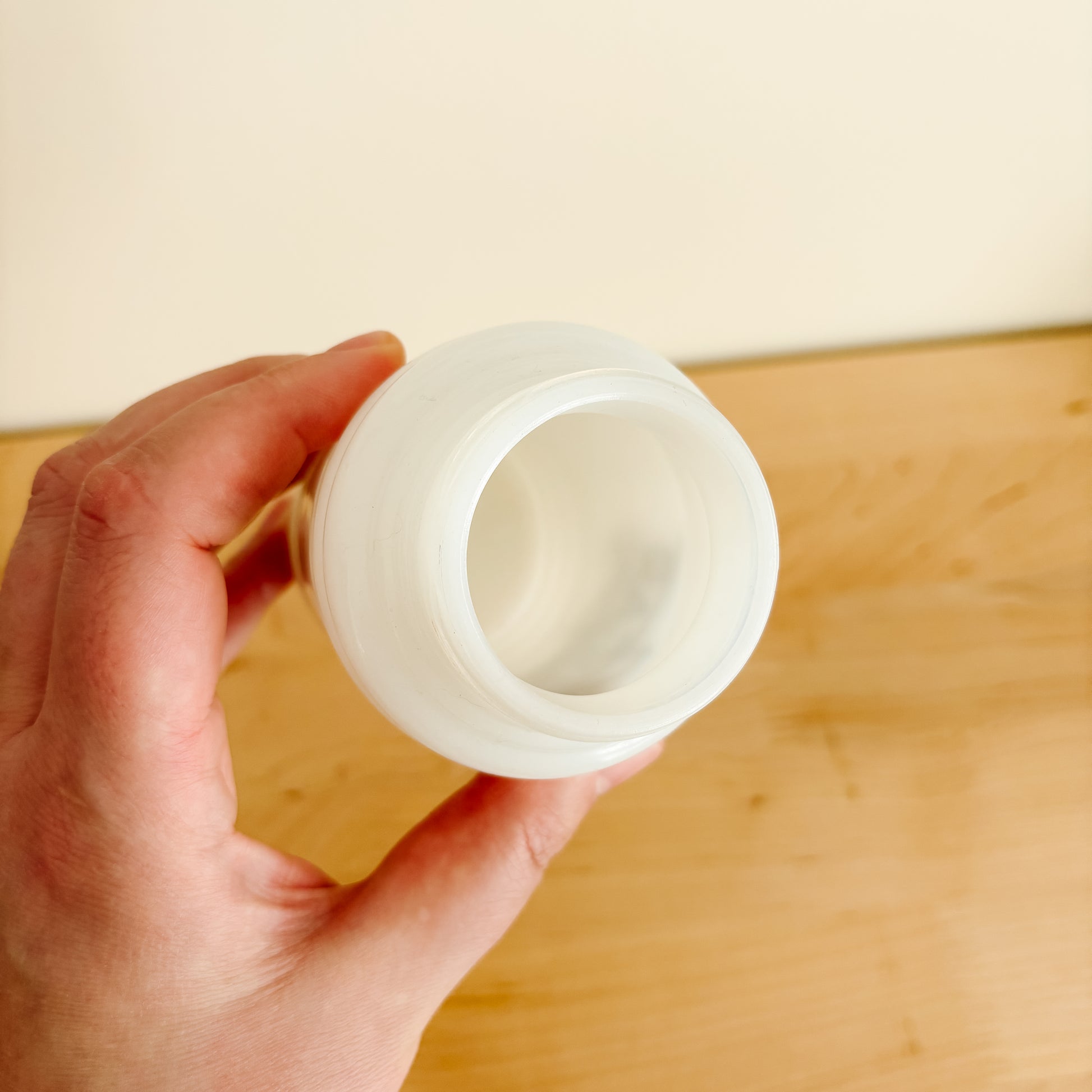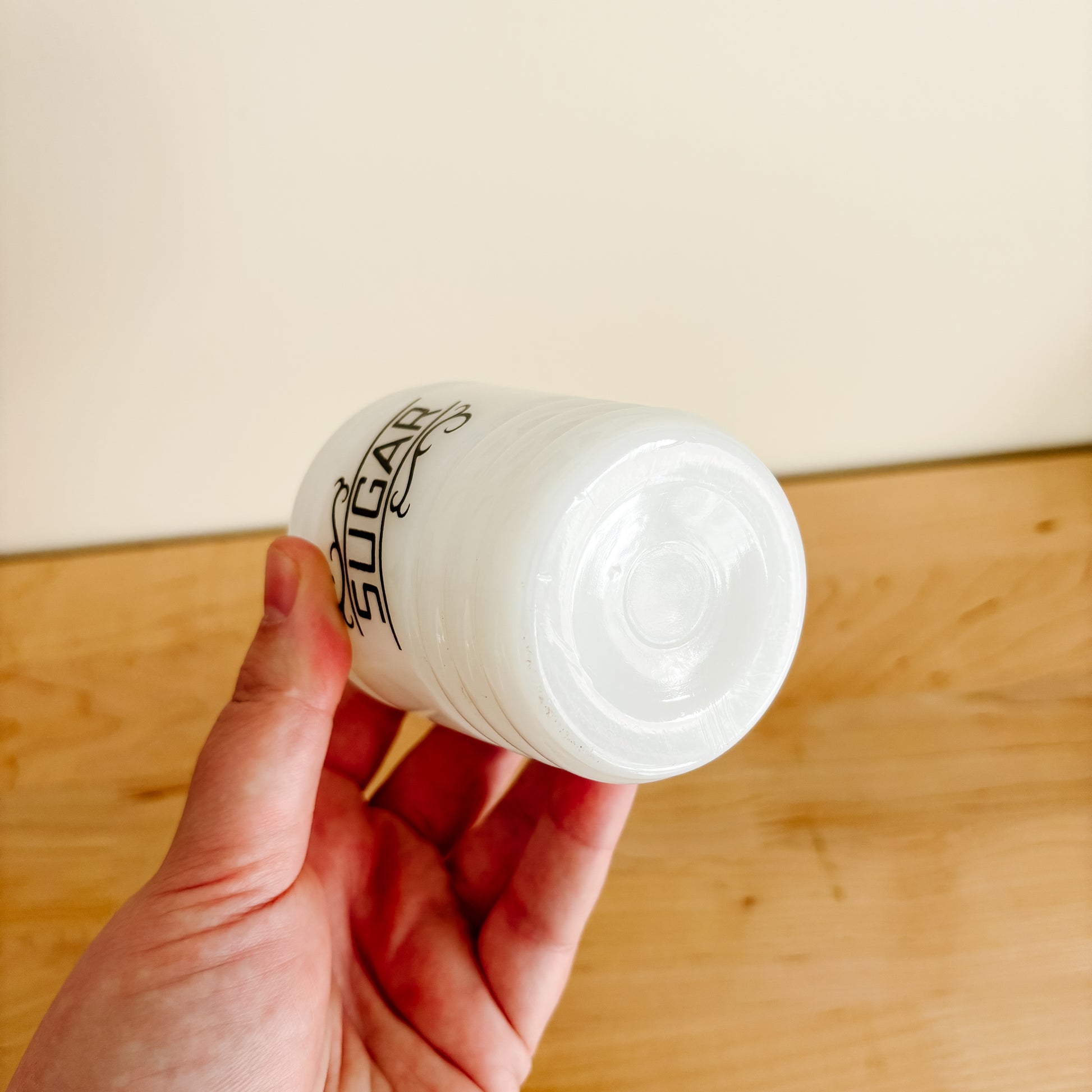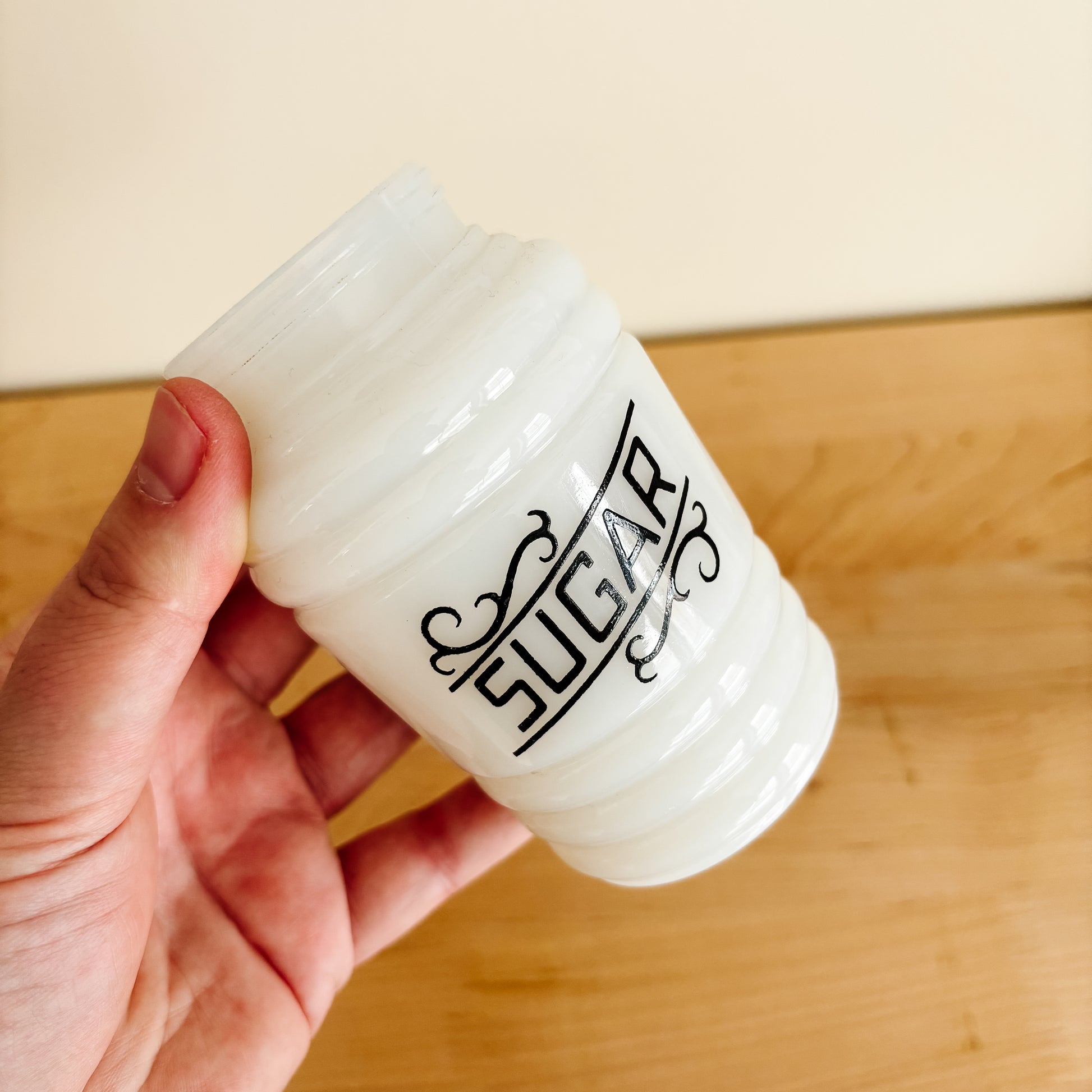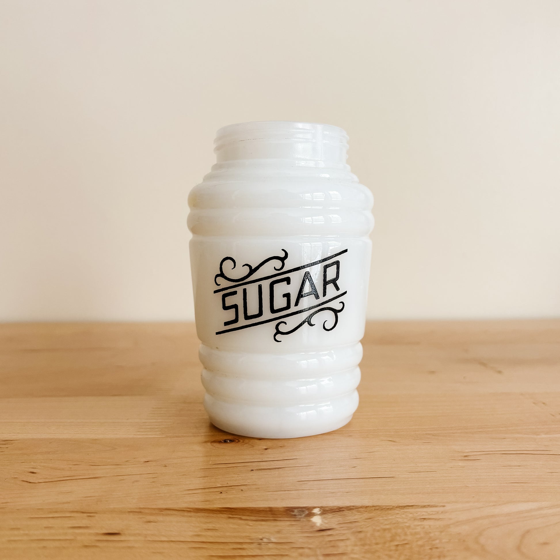These Hazel Atlas beehive shakers were kept by the stove to add a quick dash of sugar, salt, or flour to a recipe. This milk glass sugar container is in great condition and makes a cute little vase. I love the beautiful script font on the front. No lid, price reflects.