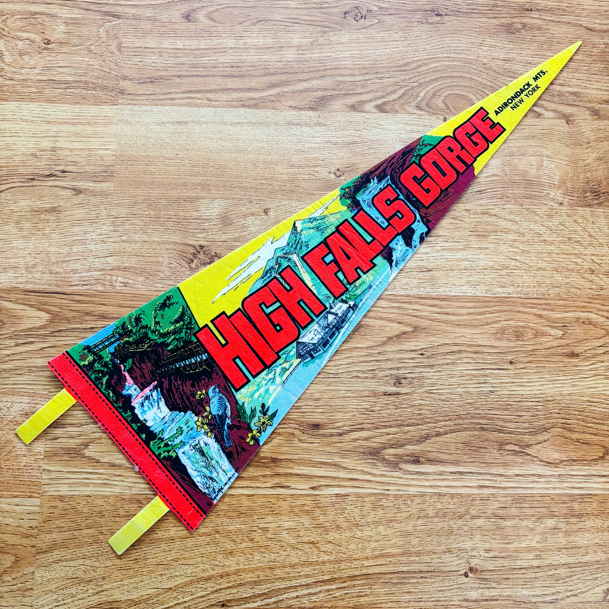Vintage multicoloured felt travel pennant from High Falls Gorge in the Adirondacks of New York. Dates back to the 1960s. In great overall condition, see all photos for details.
