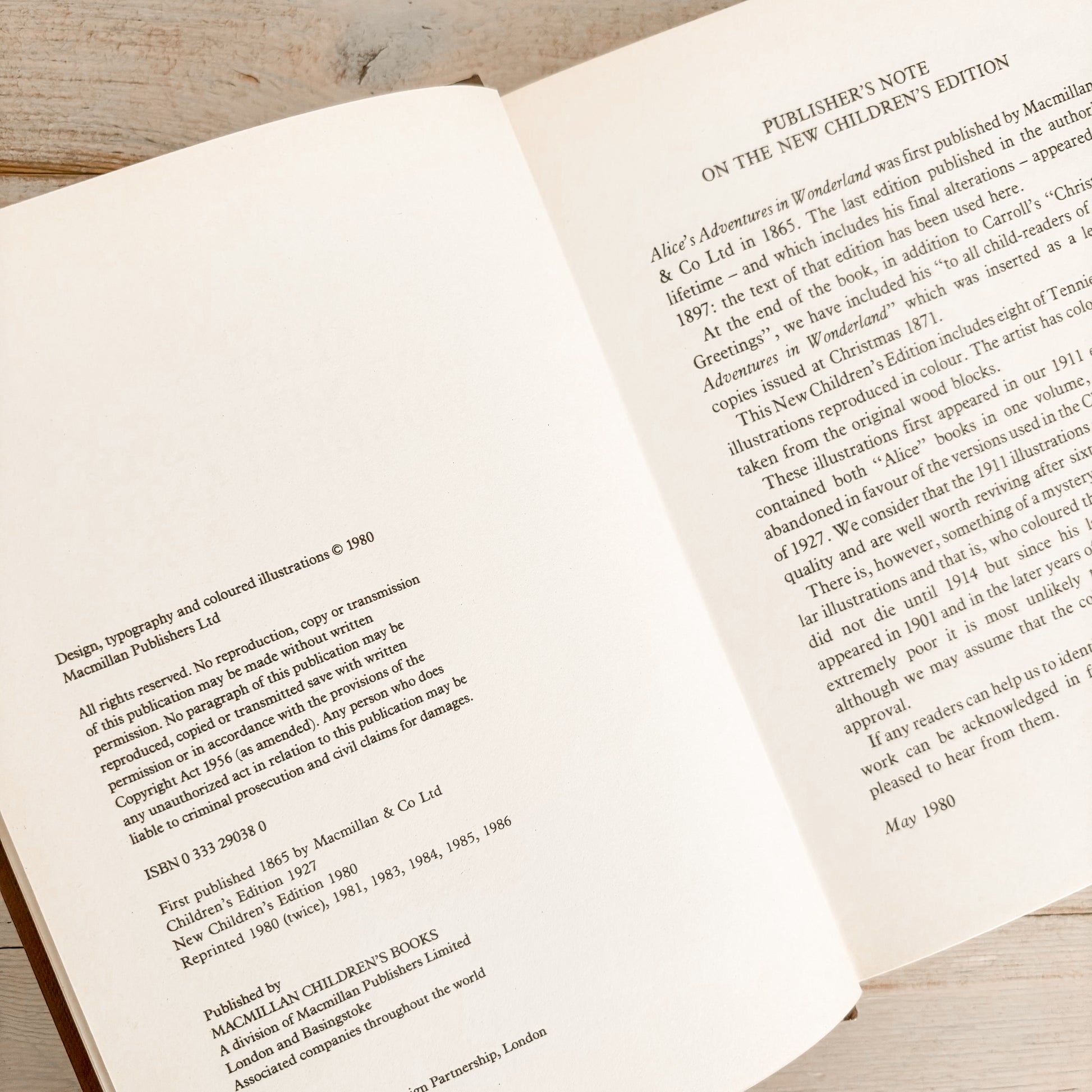 Alice's Adventures in Wonderland is an 1865 English children's novel by Lewis Carroll. This 1986 hardcover copy features gold foil text on the cover and colour images inside. Great display copy for a fan of this classic story!