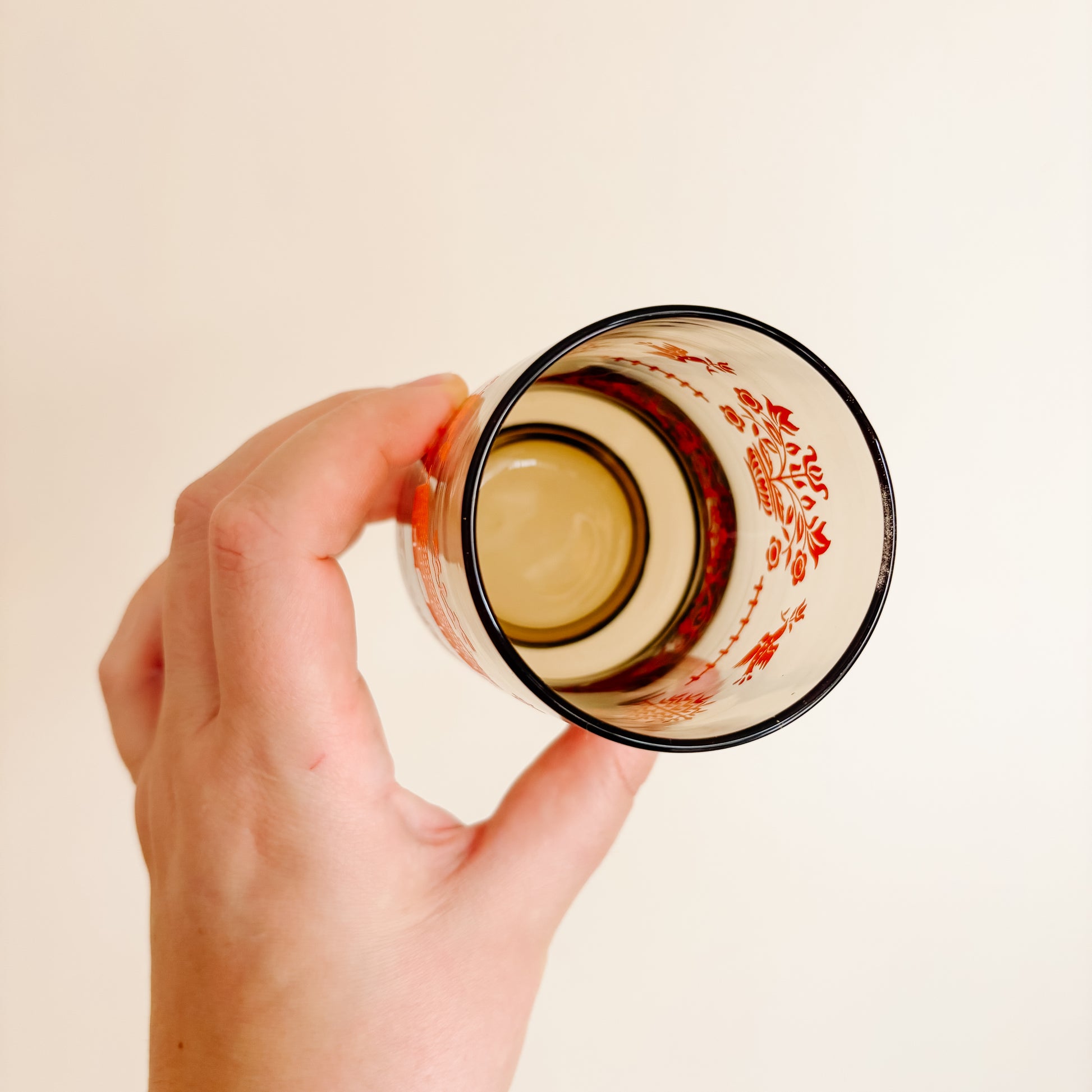 Cute set of Libbey smoky brown juice glasses with the orange Homestead pattern on all sides. In excellent condition with no damage or wear. Sold as a set of 4.