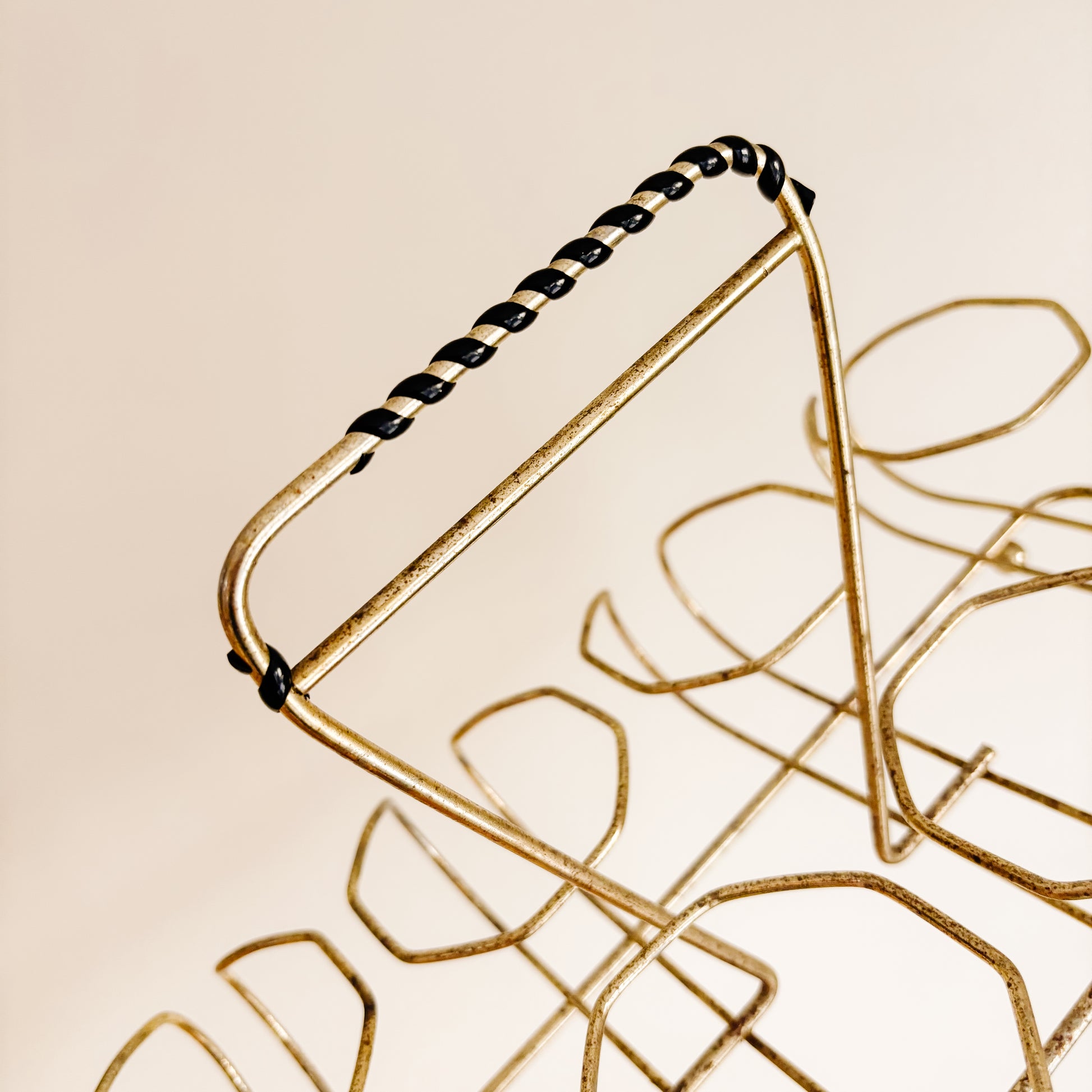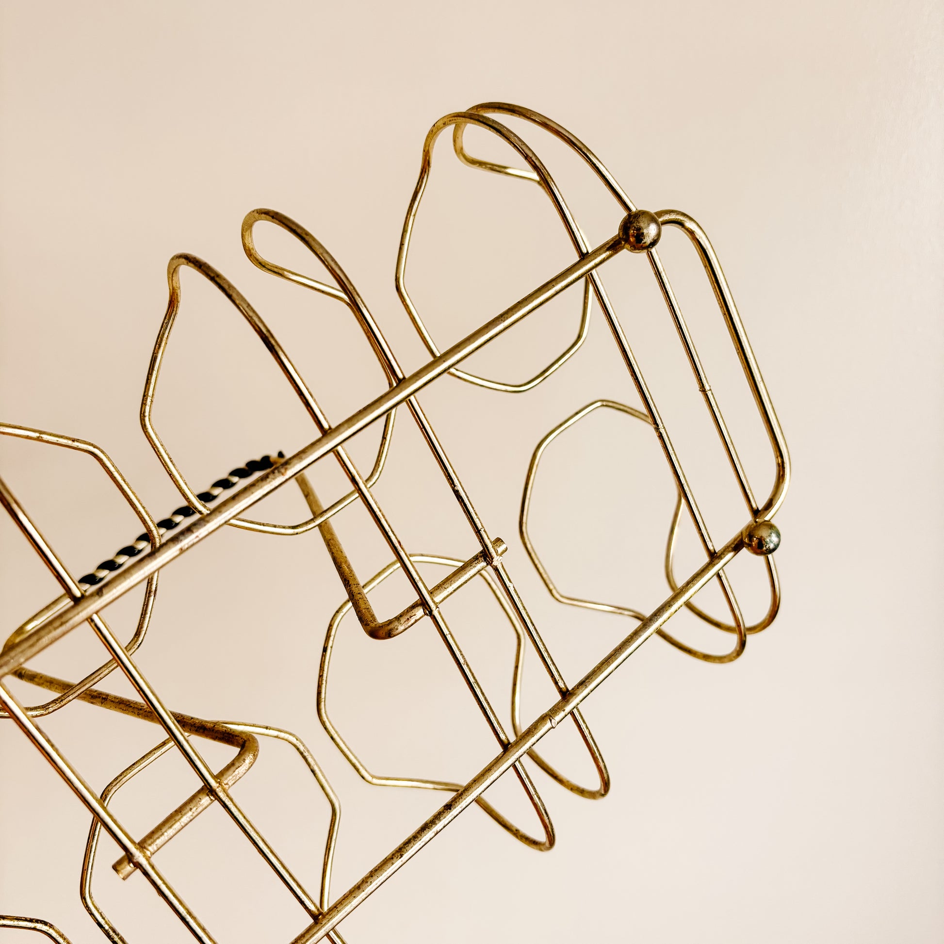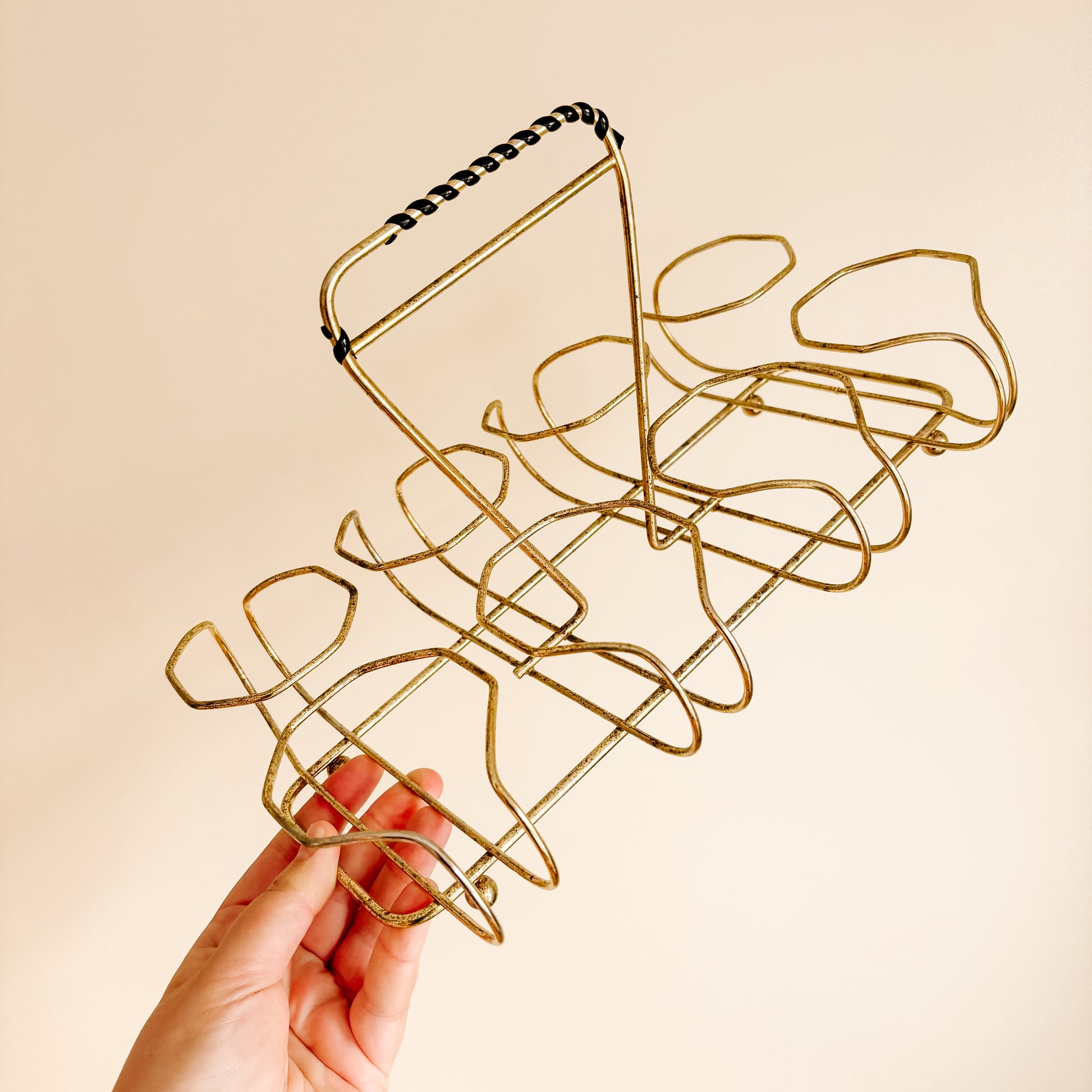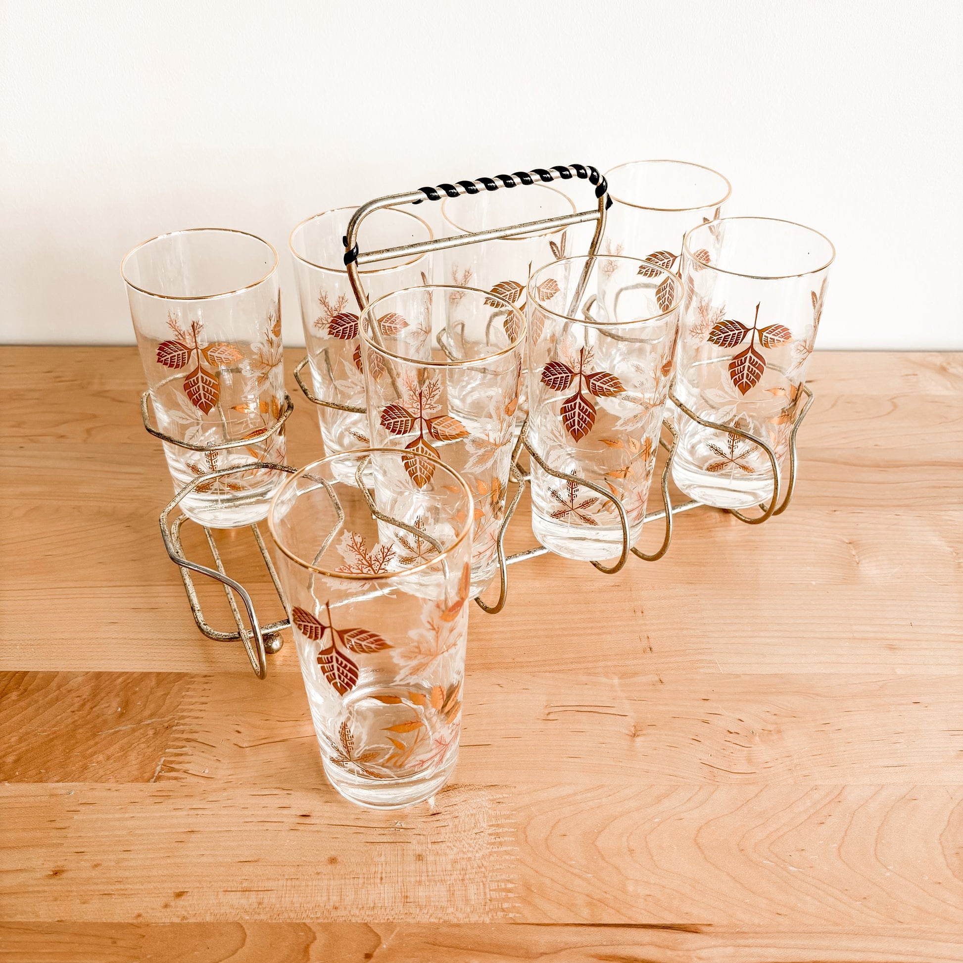 Gorgeous set of 8 highball glasses in a gold wire caddy. Glasses have gold leaf fall leaves accents on the sides and on the rim. In great condition, no scratches or wear on the gold leaf. Caddy is missing a bit of trim on the handle, see all photos. Sold as a set.