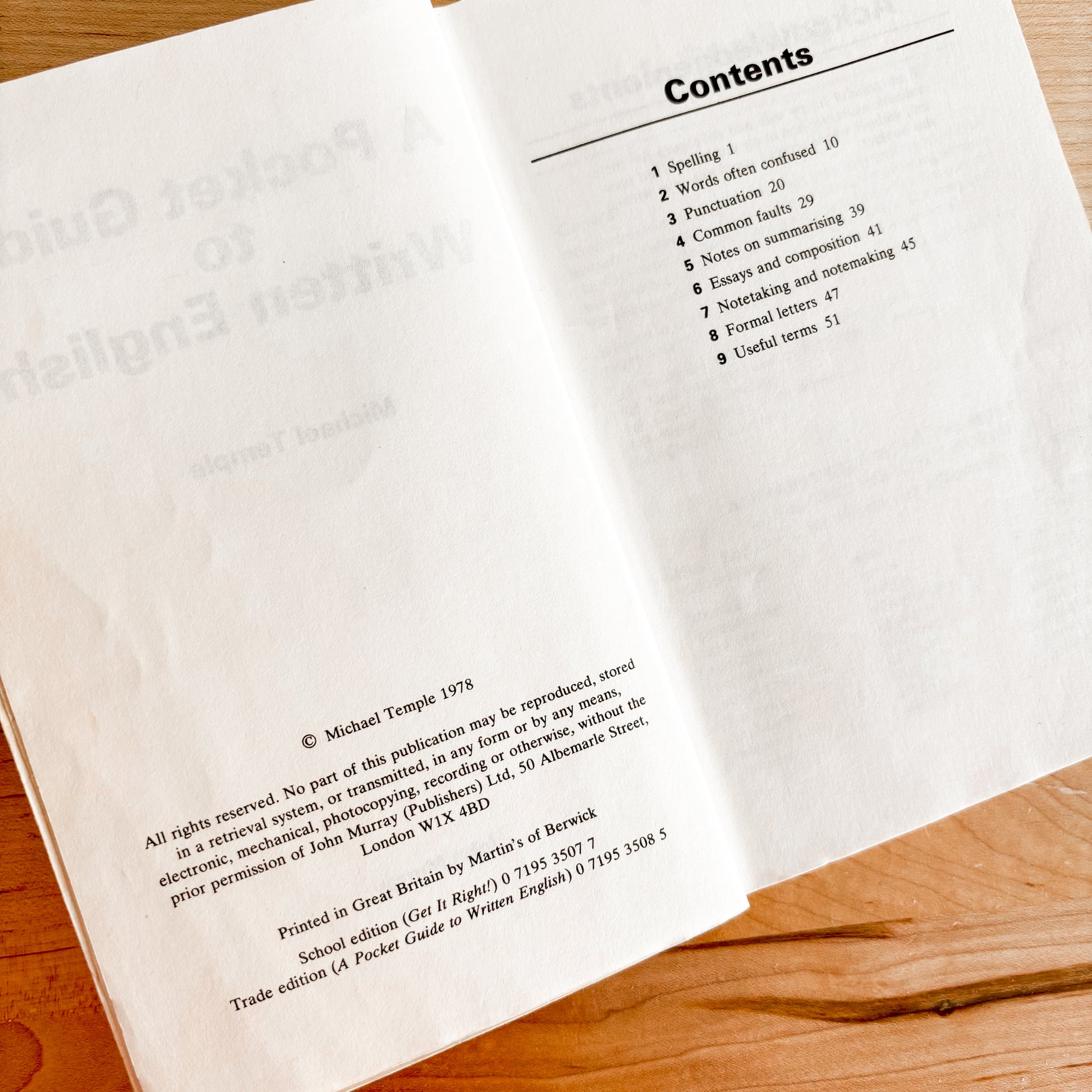 Paperback copy of A Pocket Guide to Written English by Michael Temple, published in 1978. In good overall condition with some wear and a library tag on the spine.