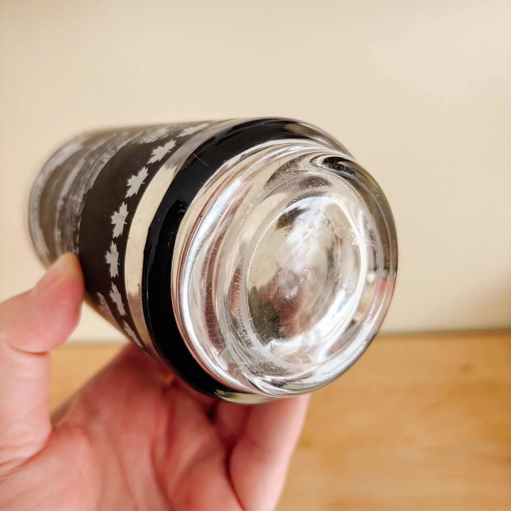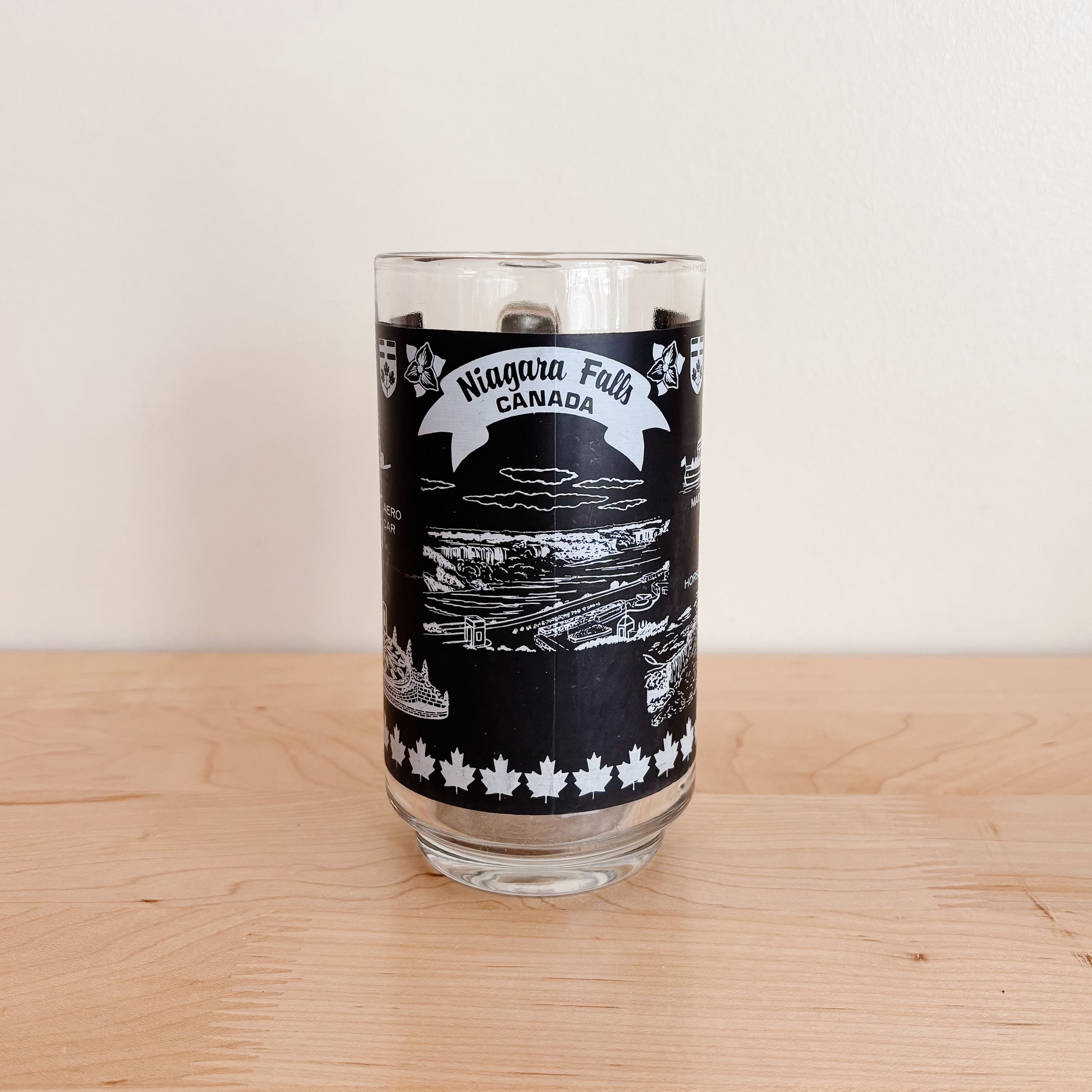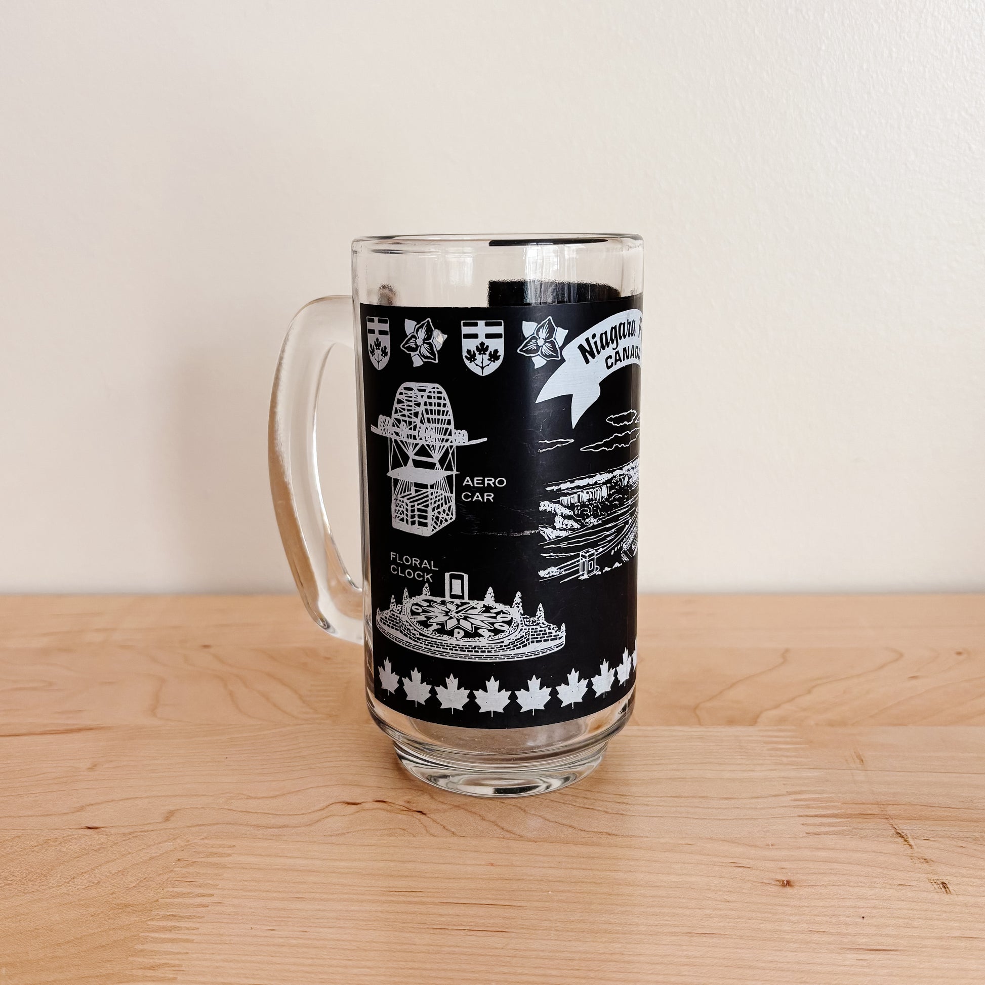 This Niagara Falls beer stein features some tourism landmarks in white on a matte black background. Perfect for Oktoberfest! Stamped Dominion on the base. Likely from the 1970s.