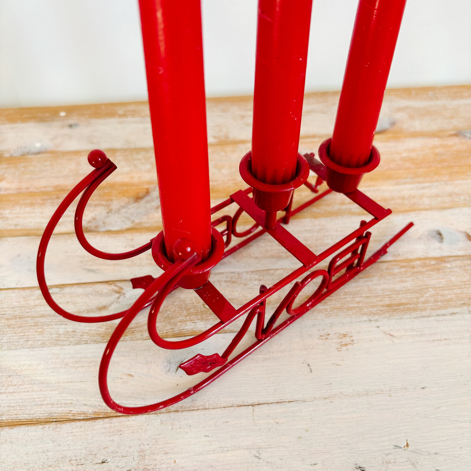 Cute red wire Santa's sleigh with NOEL written on the sides, holds 3 taper candles (included).