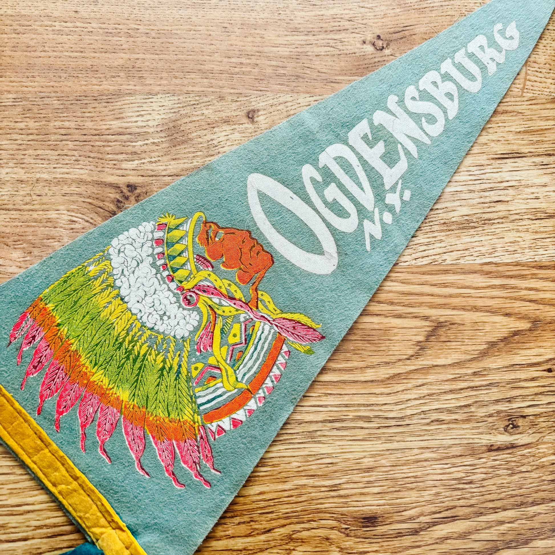 Vintage gray blue felt travel pennant from Ogdenburg, New York. Dates back to the 1960s. In good overall condition with fading, see all photos for details.