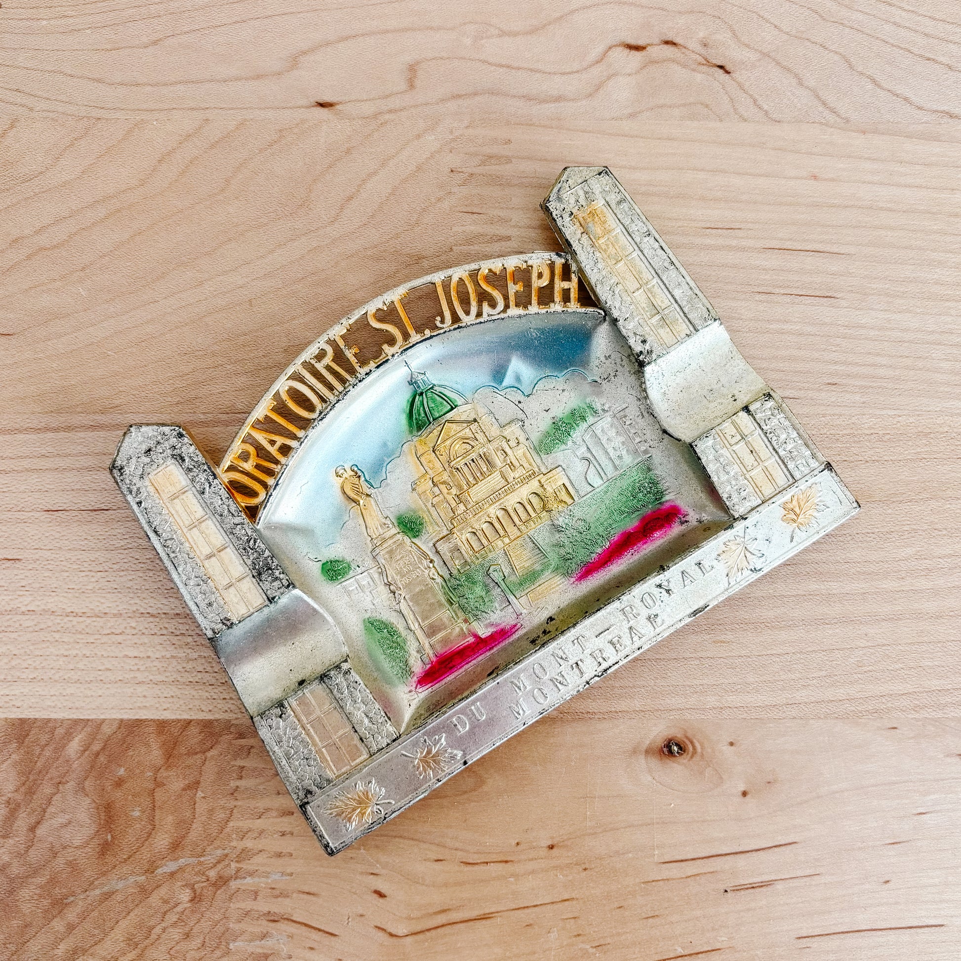 Vintage tin ashtray depicting Oratoire St-Joseph in Montreal. Fun addition to a gallery wall! Some fading on the colours. Stamped made in Japan.