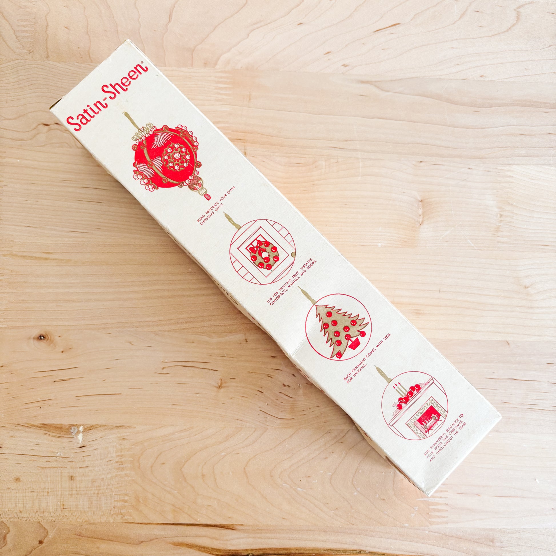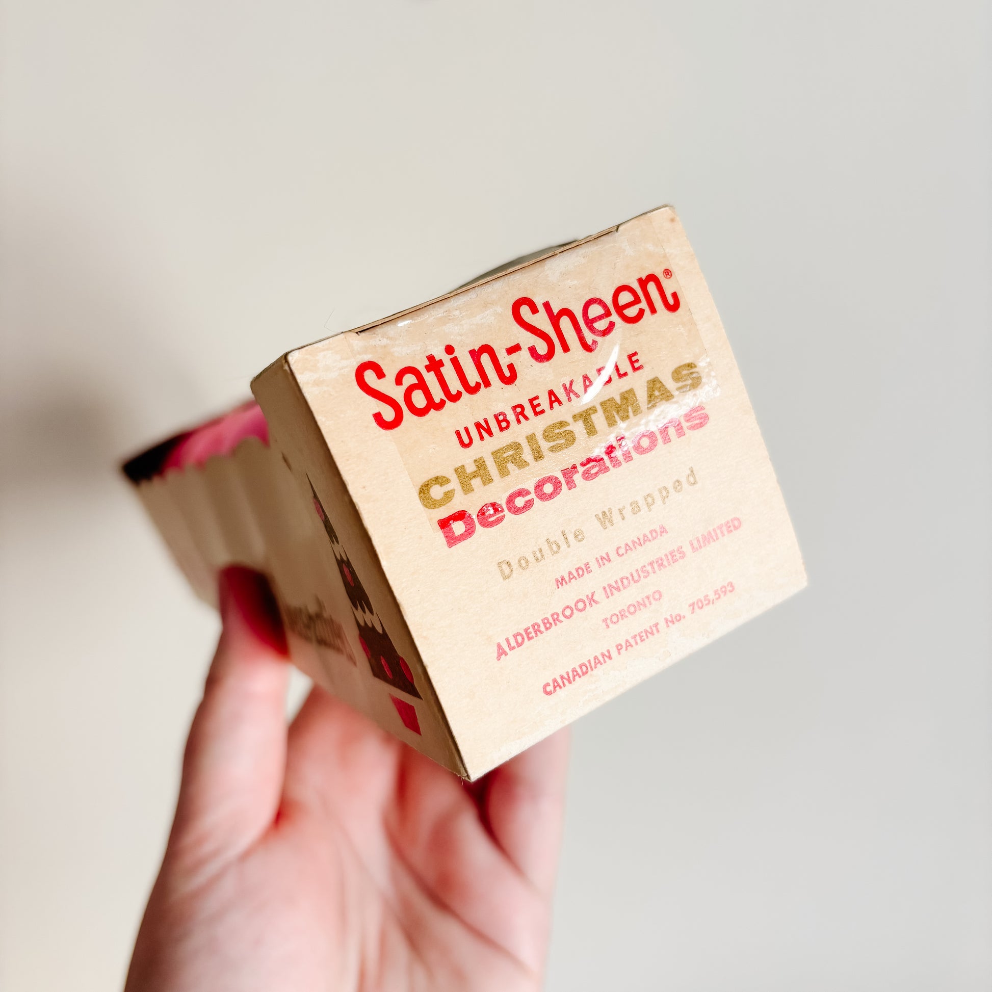 Set of 5 Alderbrook Canada satin thread ornaments. Shiny pink, in good overall condition with some discolouration/fuzz consistent with age. Includes original box!