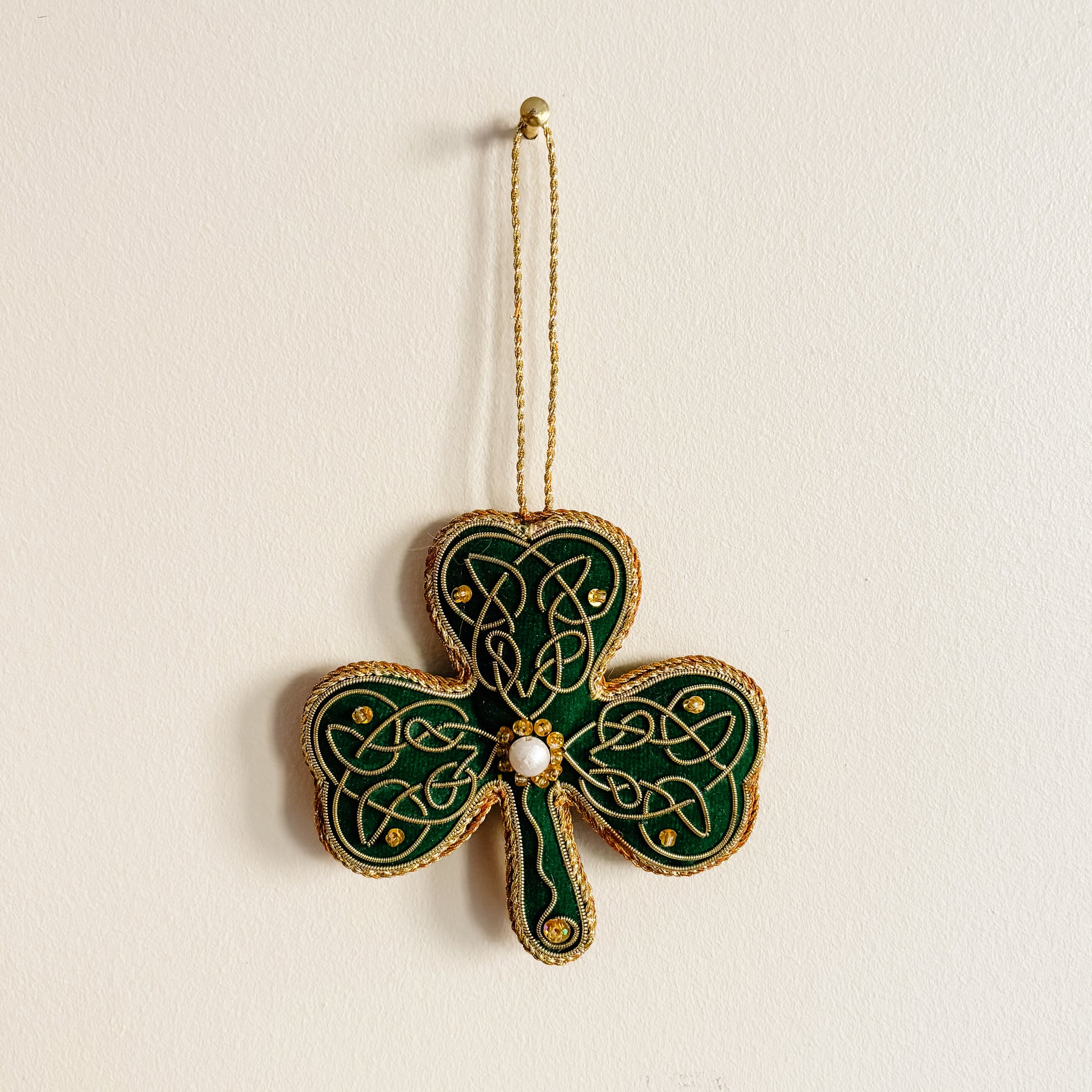This Christmas tree ornament features a green shamrock with gold thread interlacing, shiny beads, and a pearly accent in the centre.