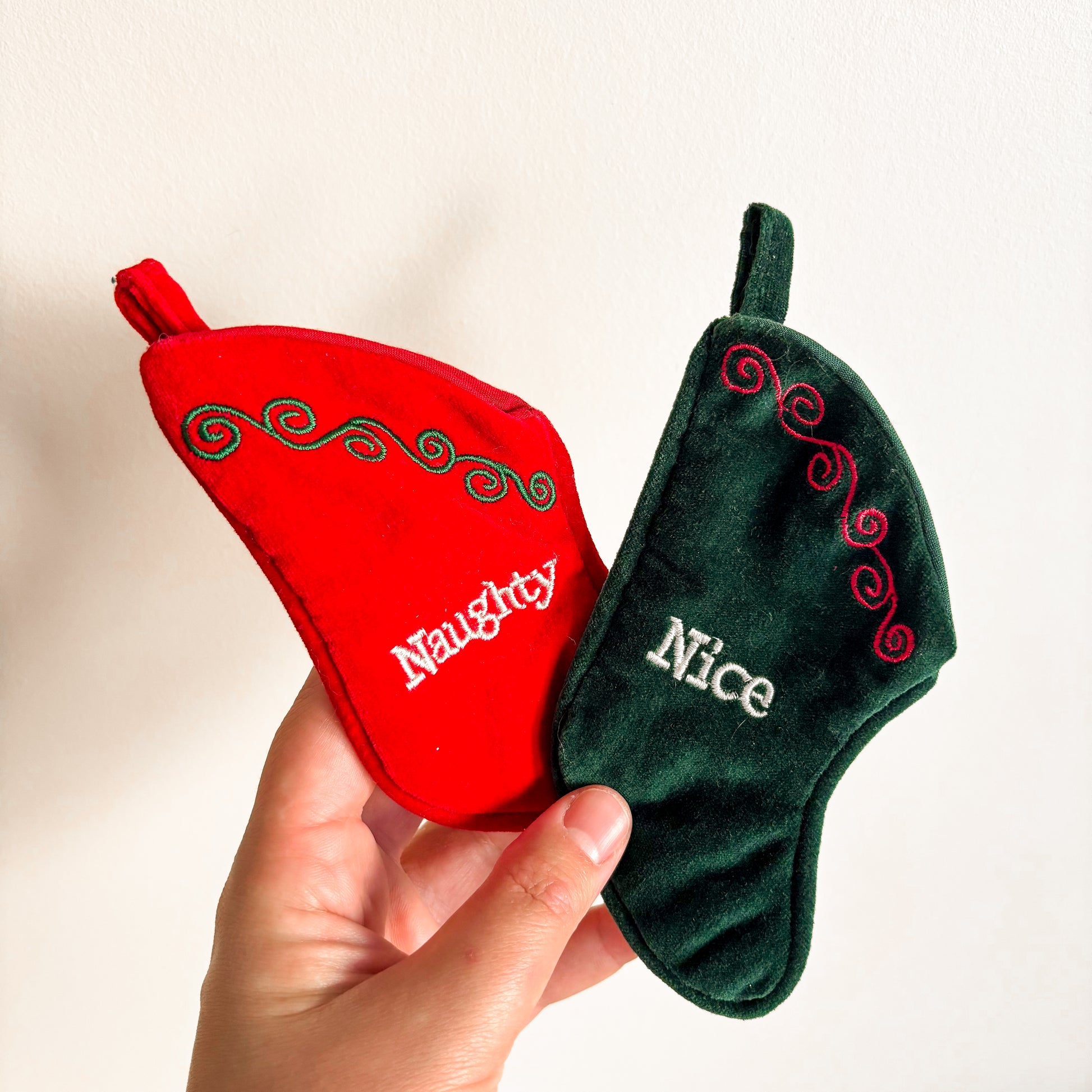 These velvet fabric Naughty and Nice stockings open up to store little surprises on the tree. Sold as a pair.