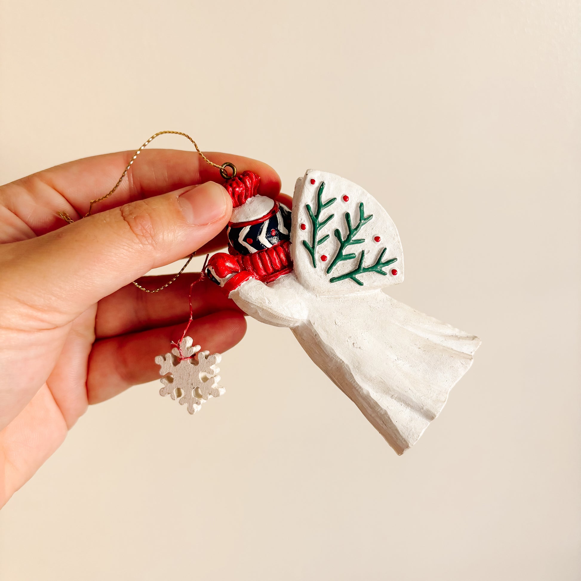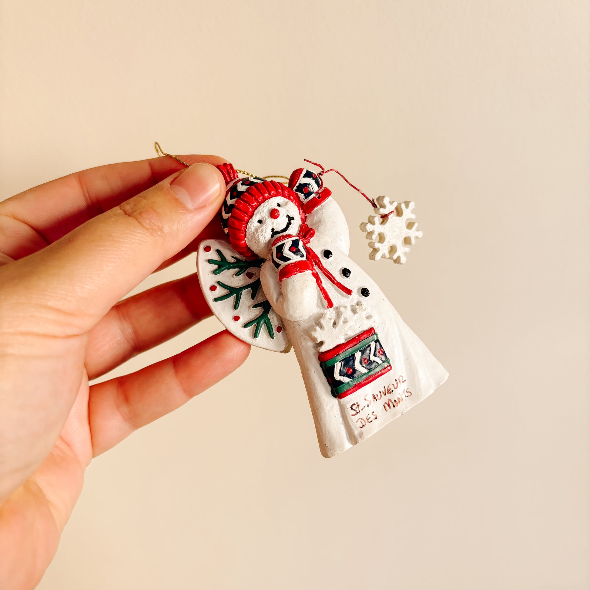 This Christmas tree ornament features a snowman with angel wings and a dangling snowflake. Souvenir of Saint-Sauveur-des-Monts, Quebec.