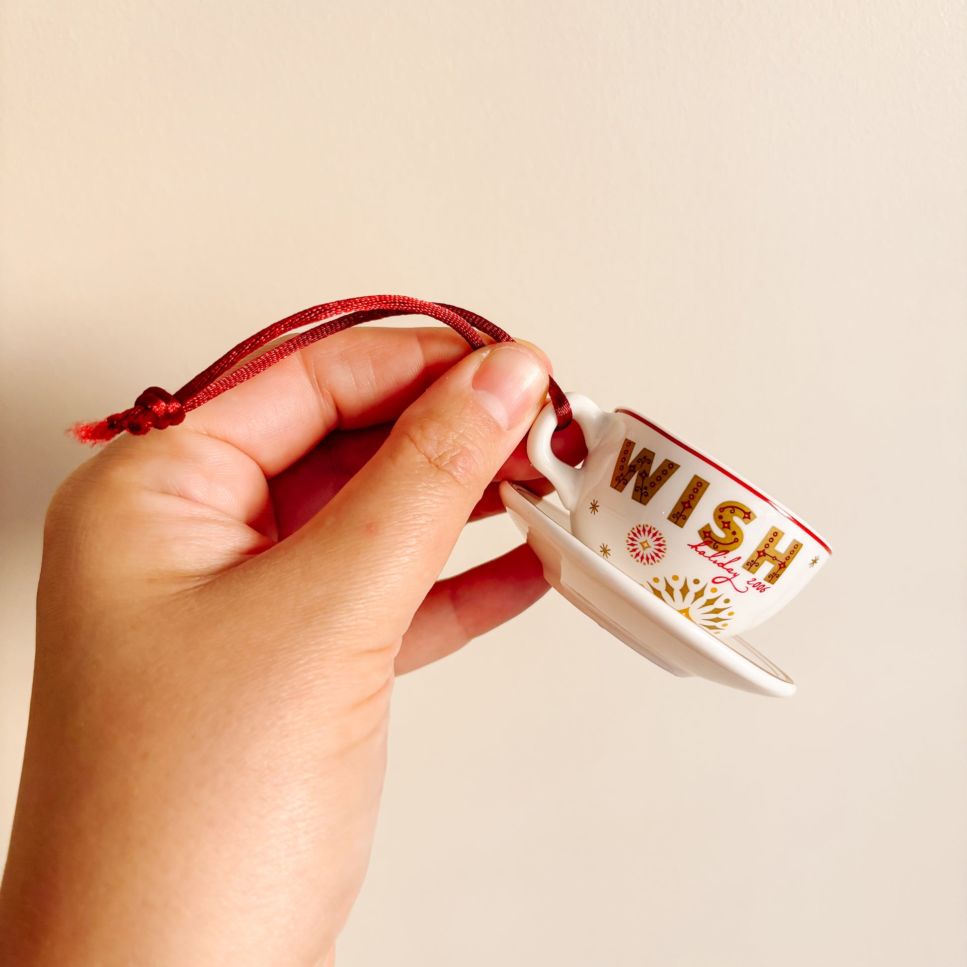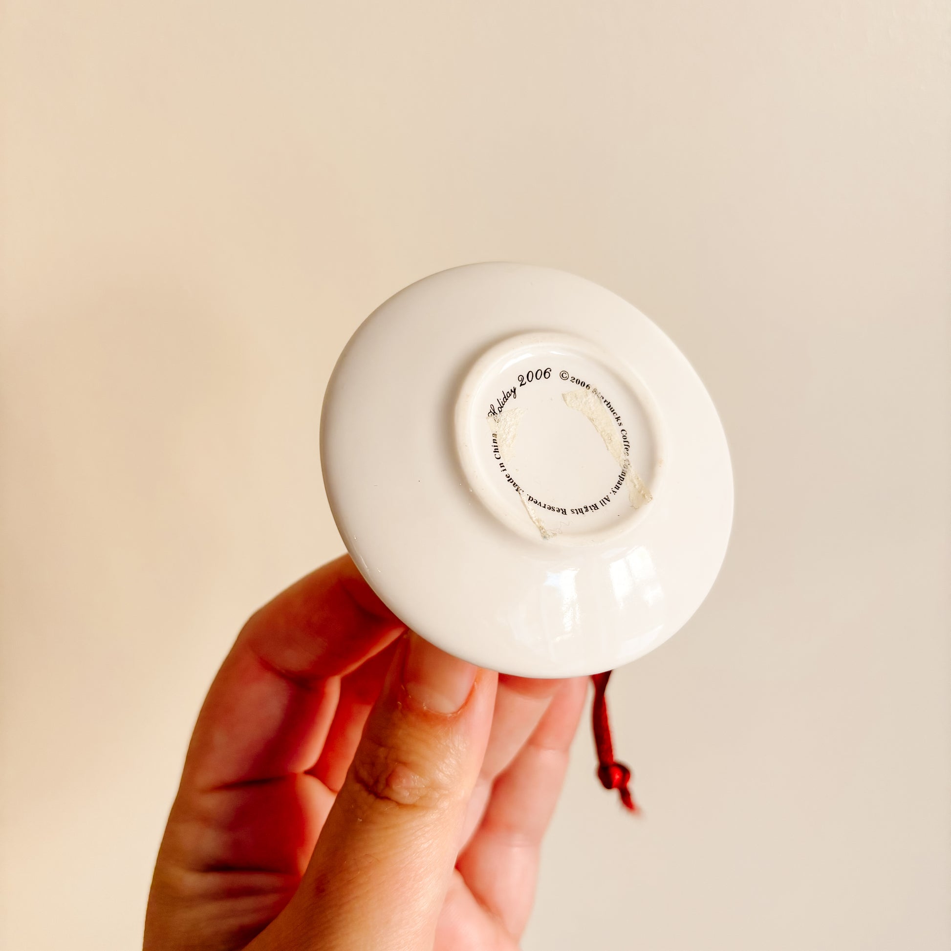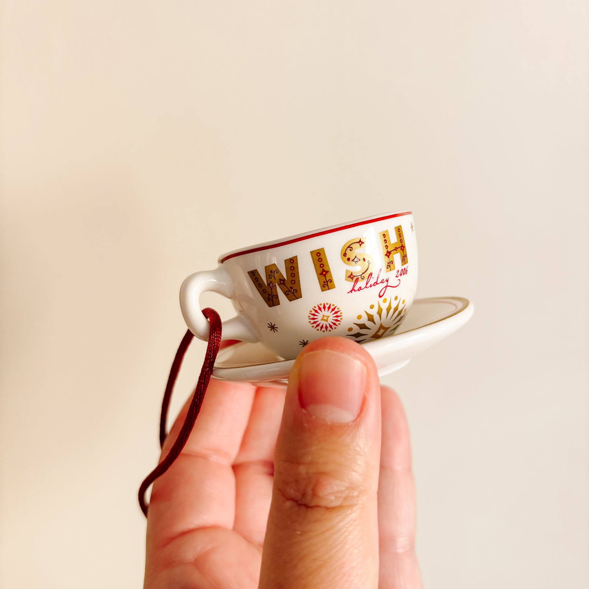 The Starbucks Holiday 2006 Christmas tree ornament is a miniature white ceramic mug and saucer with "Wish" in gold on both sides.