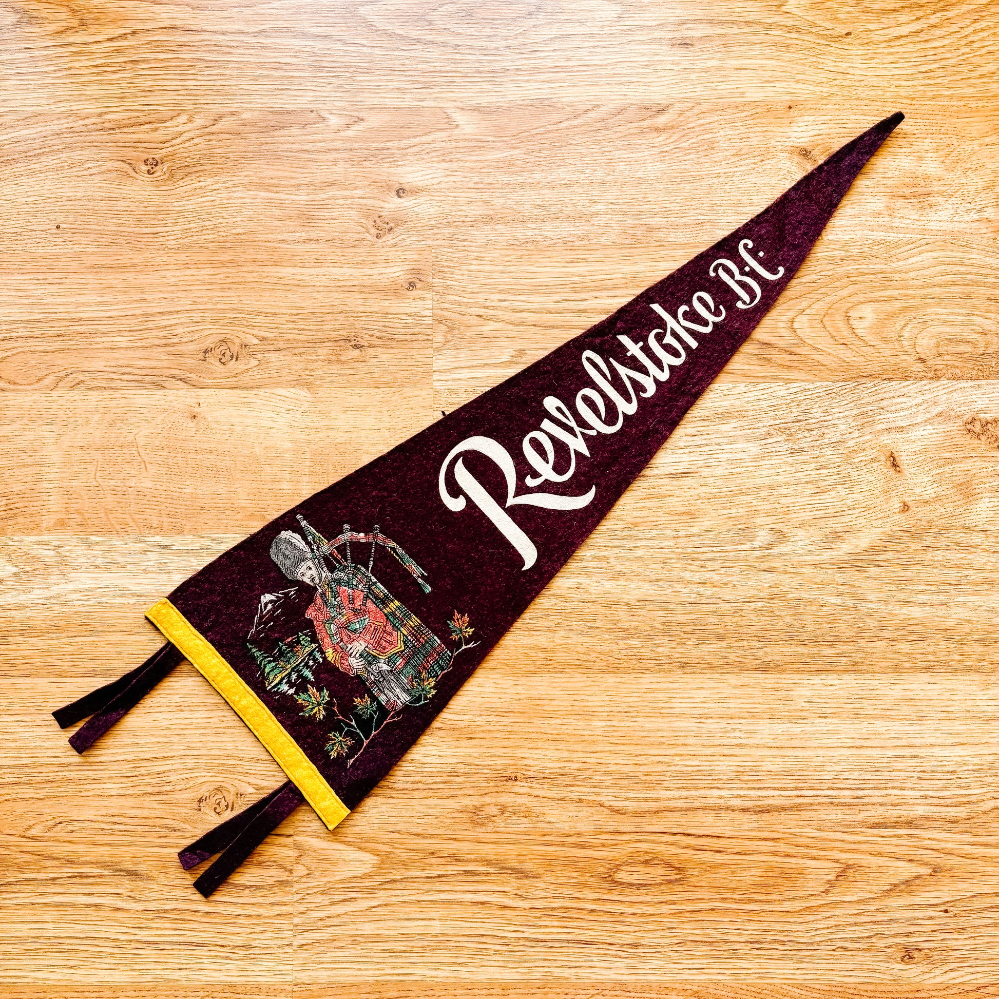 Vintage maroon and yellow felt travel pennant from Revelstoke, British Columbia. In great overall condition, see all photos for details.