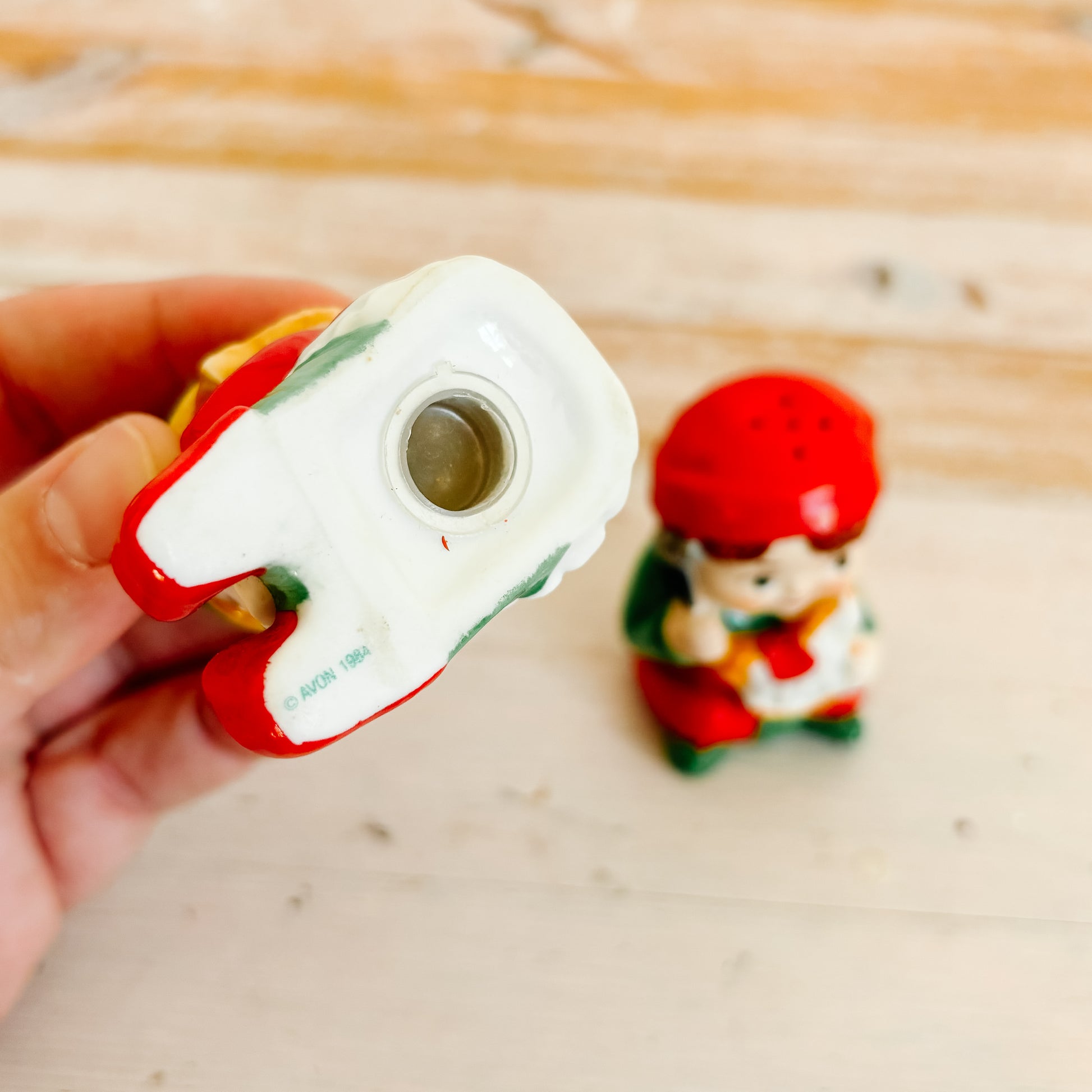 Cute red and green salt and pepper shakers shaped like Santa's elves. Stamped Avon 1984.