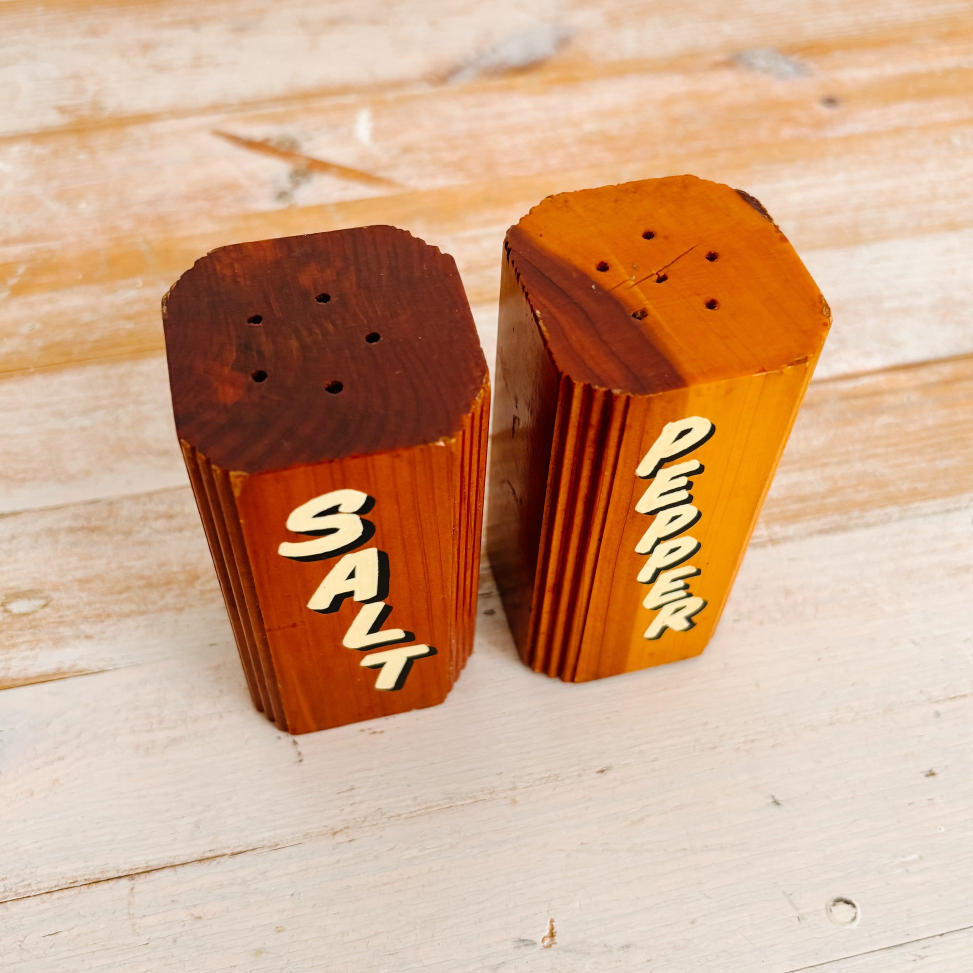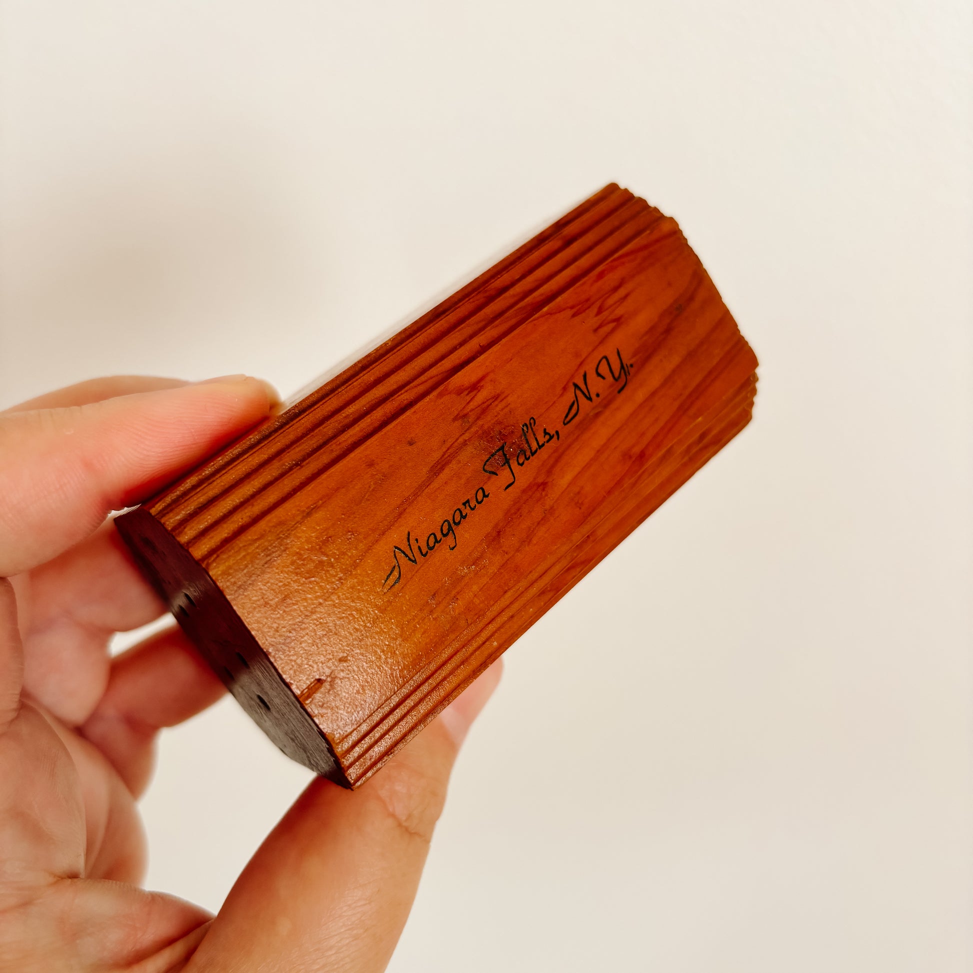 Wooden salt & pepper set with "Niagara Falls, NY" on the side. Plastic stoppers. In good overall condition, great graphic look.