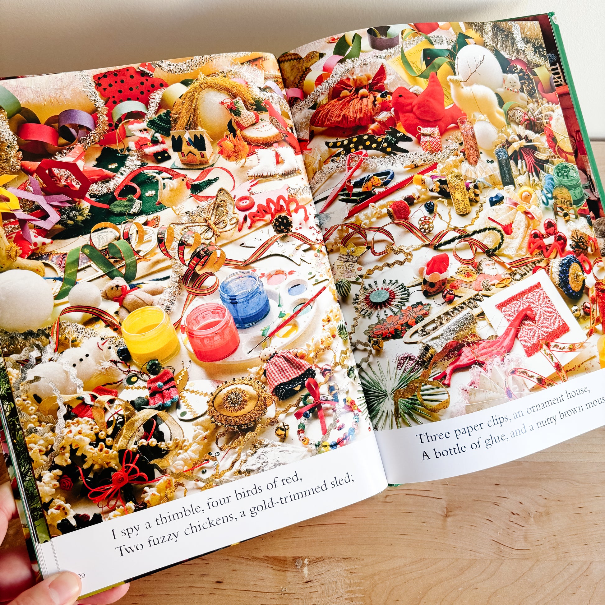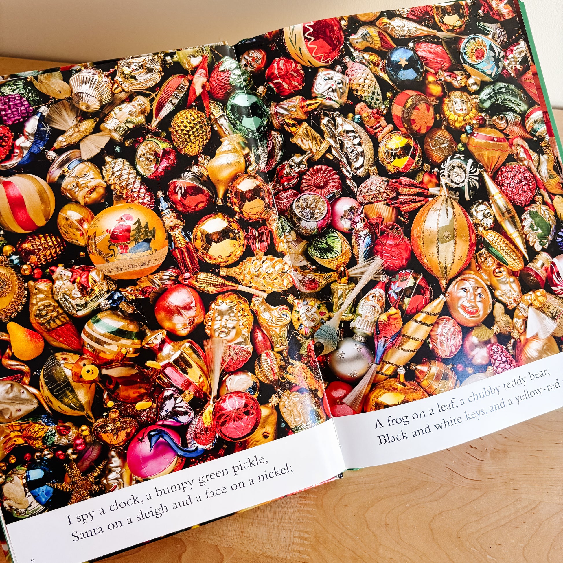 A fun Christmas activity for search-and-find fans of all ages! I Spy Christmas is full of beautiful vintage flat lays with ornaments, toys, and natural decor. In great overall condition, top back cover corner has a bit of wear.