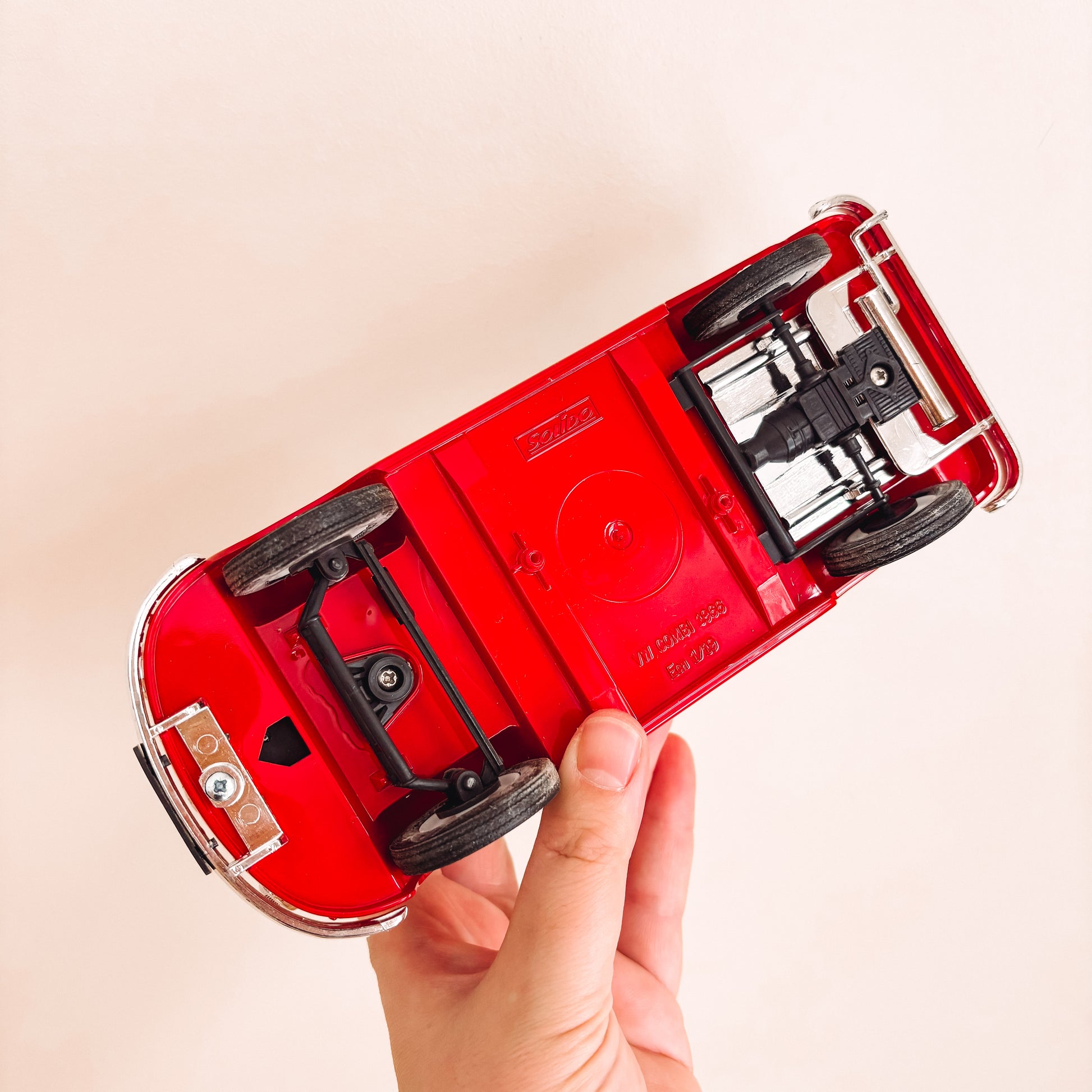 This Solido VW Red Samba Bus is such a great display item! Features VW branding on the front and wheels, the back window opens and the wheels roll. In perfect condition. Stamped Solido 1:19 scale model on the base.
