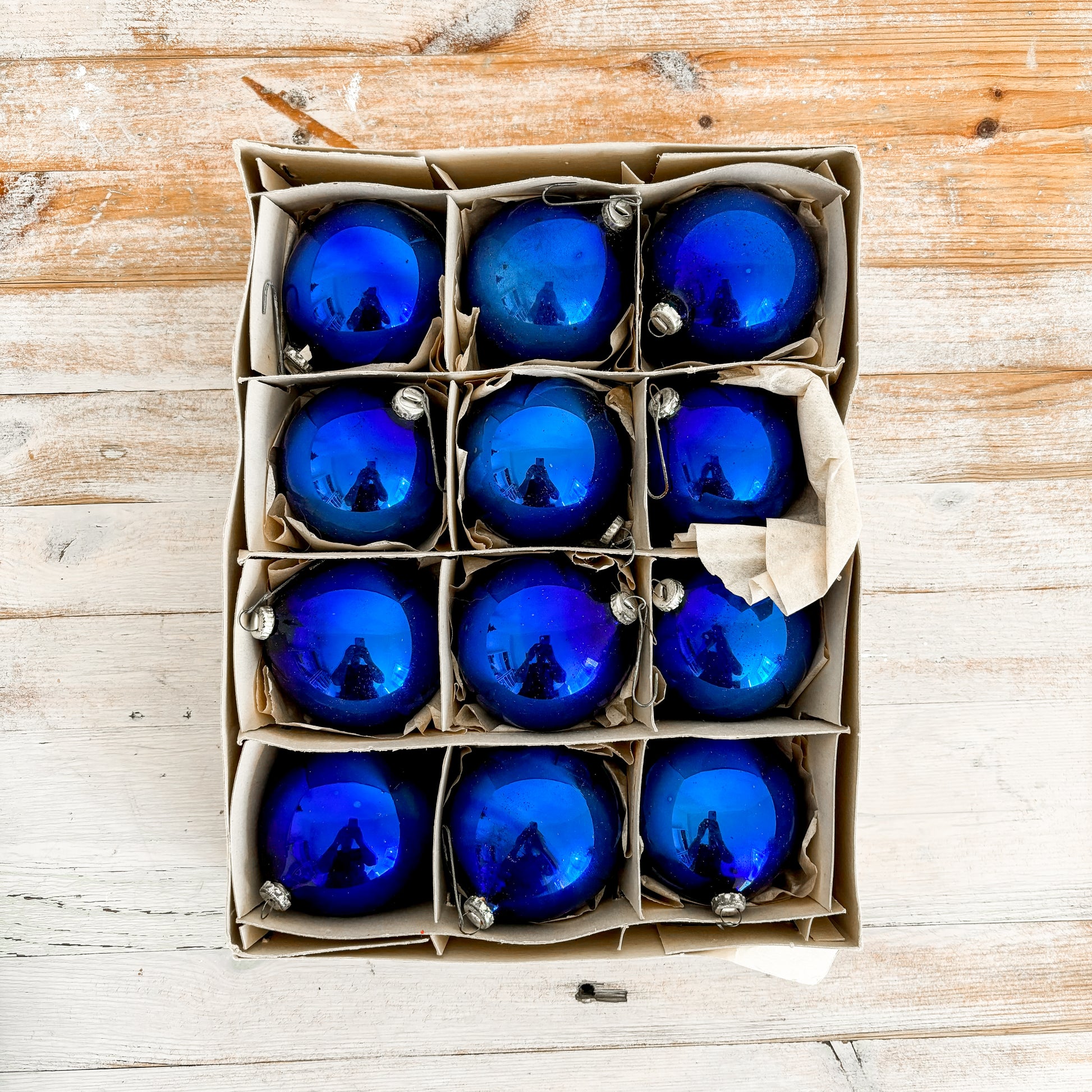 Set of dark blue vintage glass ornaments by Santa Land. Bottom of the box is stamped 23/12/72.
