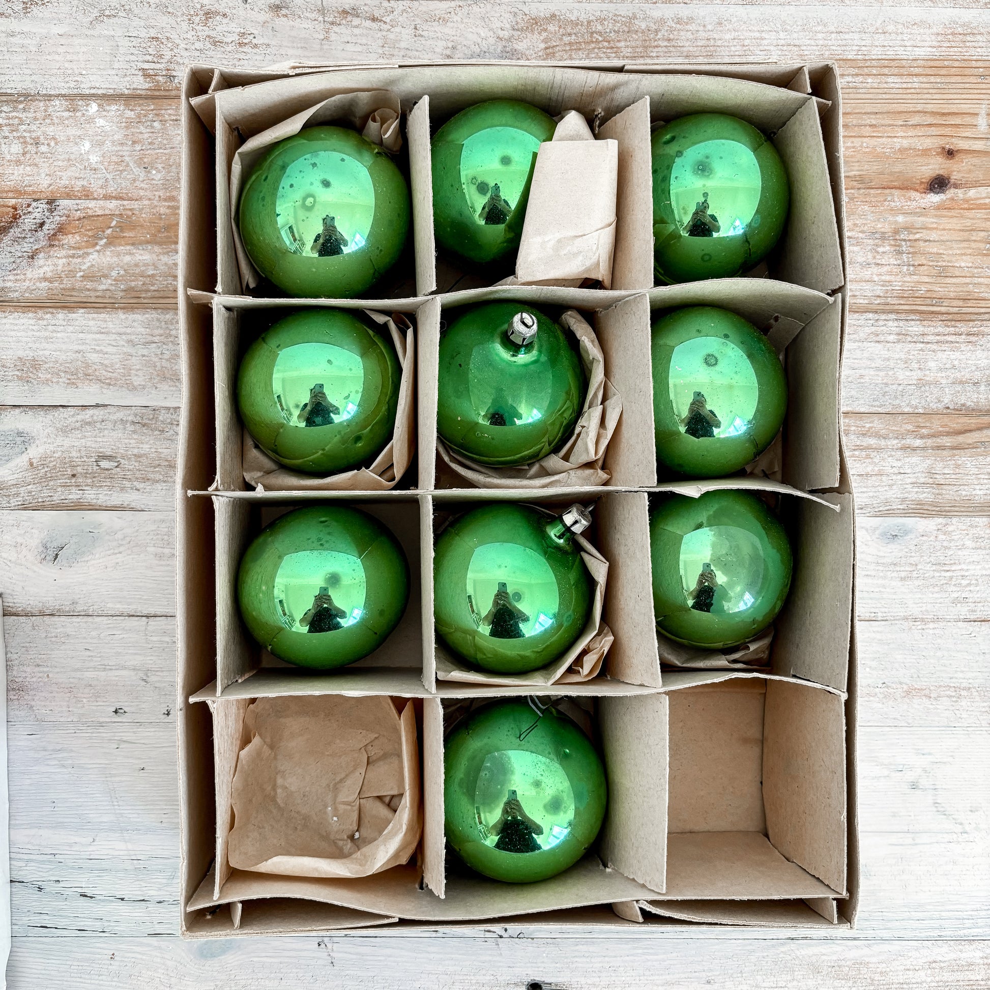 Set of light green vintage glass ornaments by Santa Land. Bottom of the box is stamped 28/4/71.