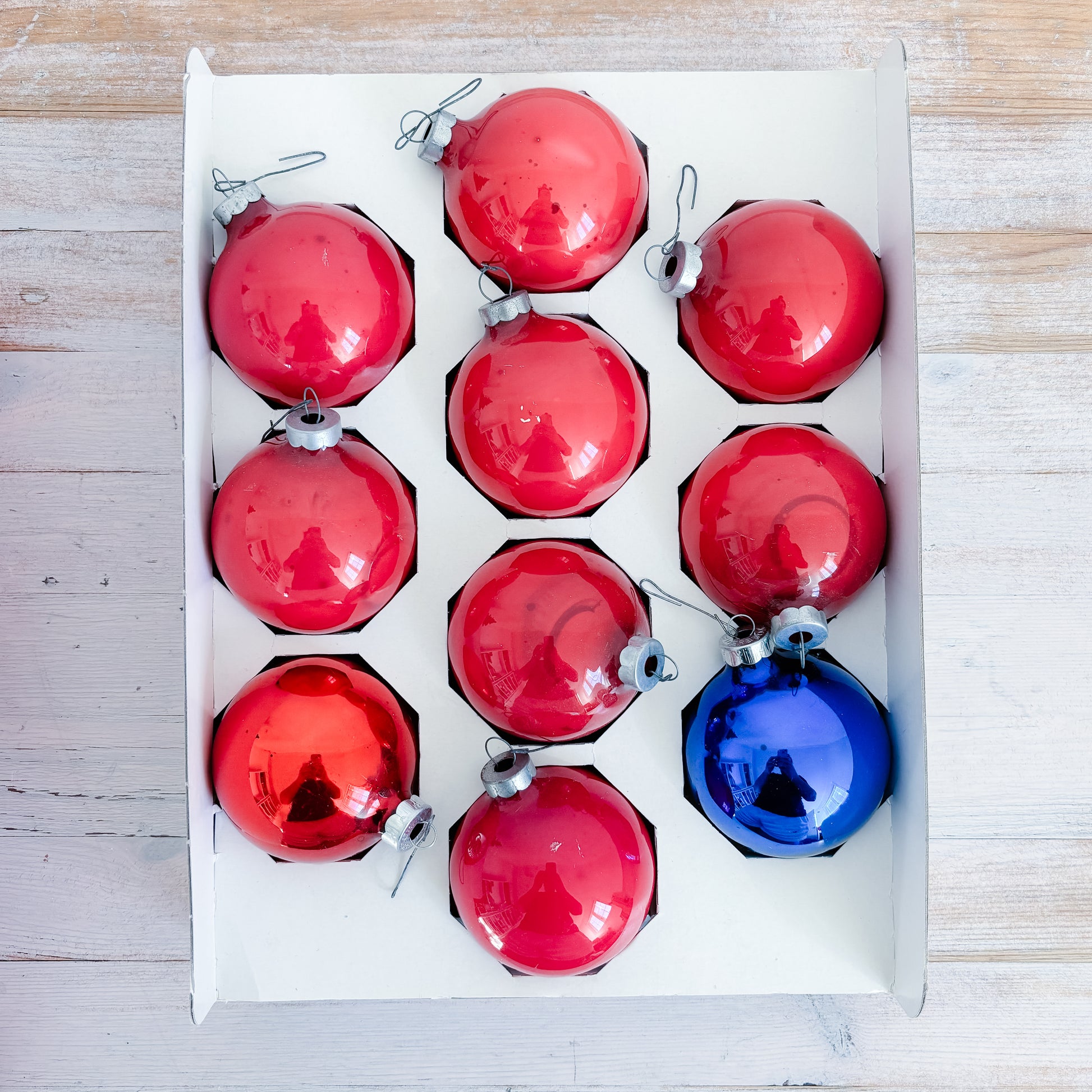Set of Zellers Holly glass ornaments, 9 fuschia pink and one royal blue. In good vintage condition with some wear consistent with age.