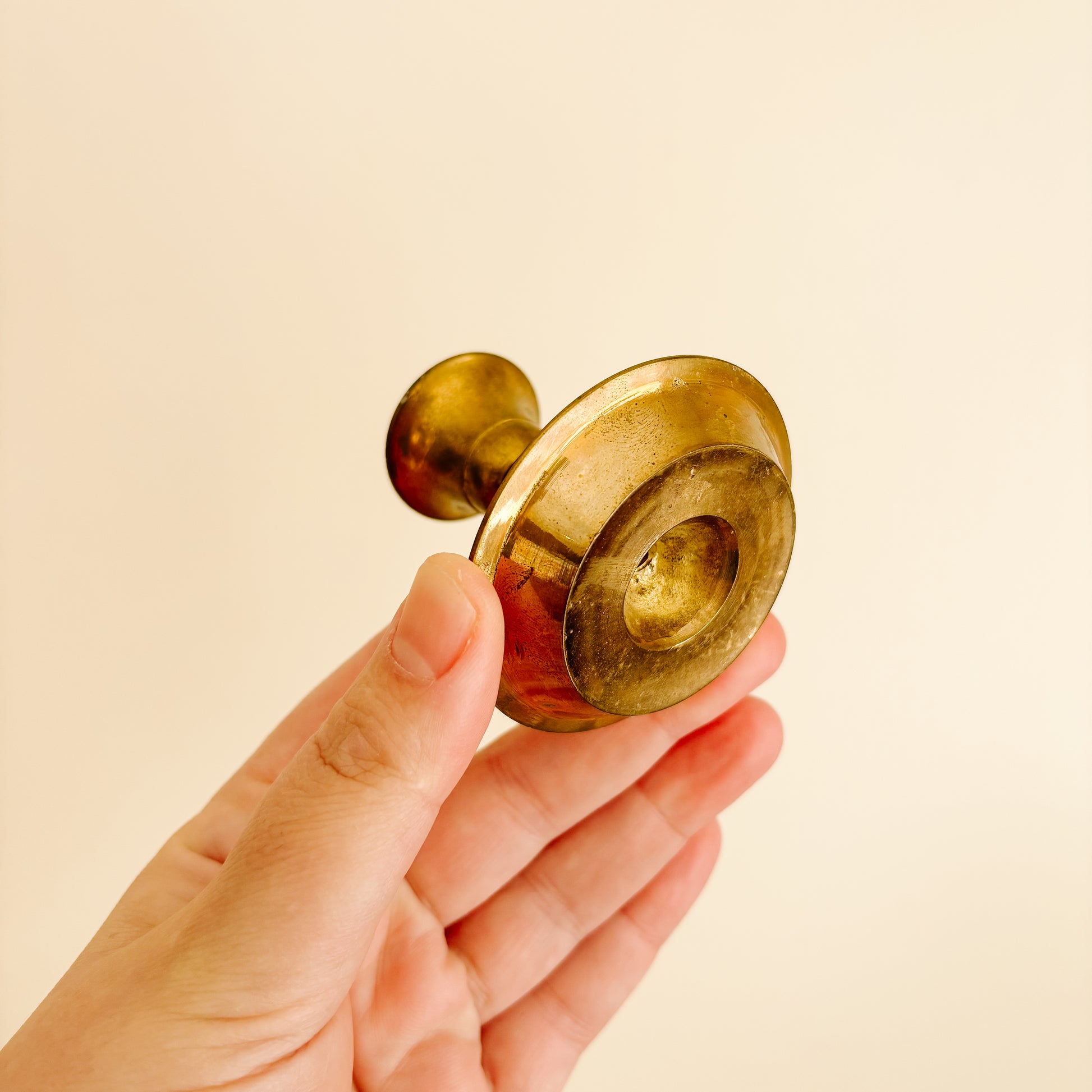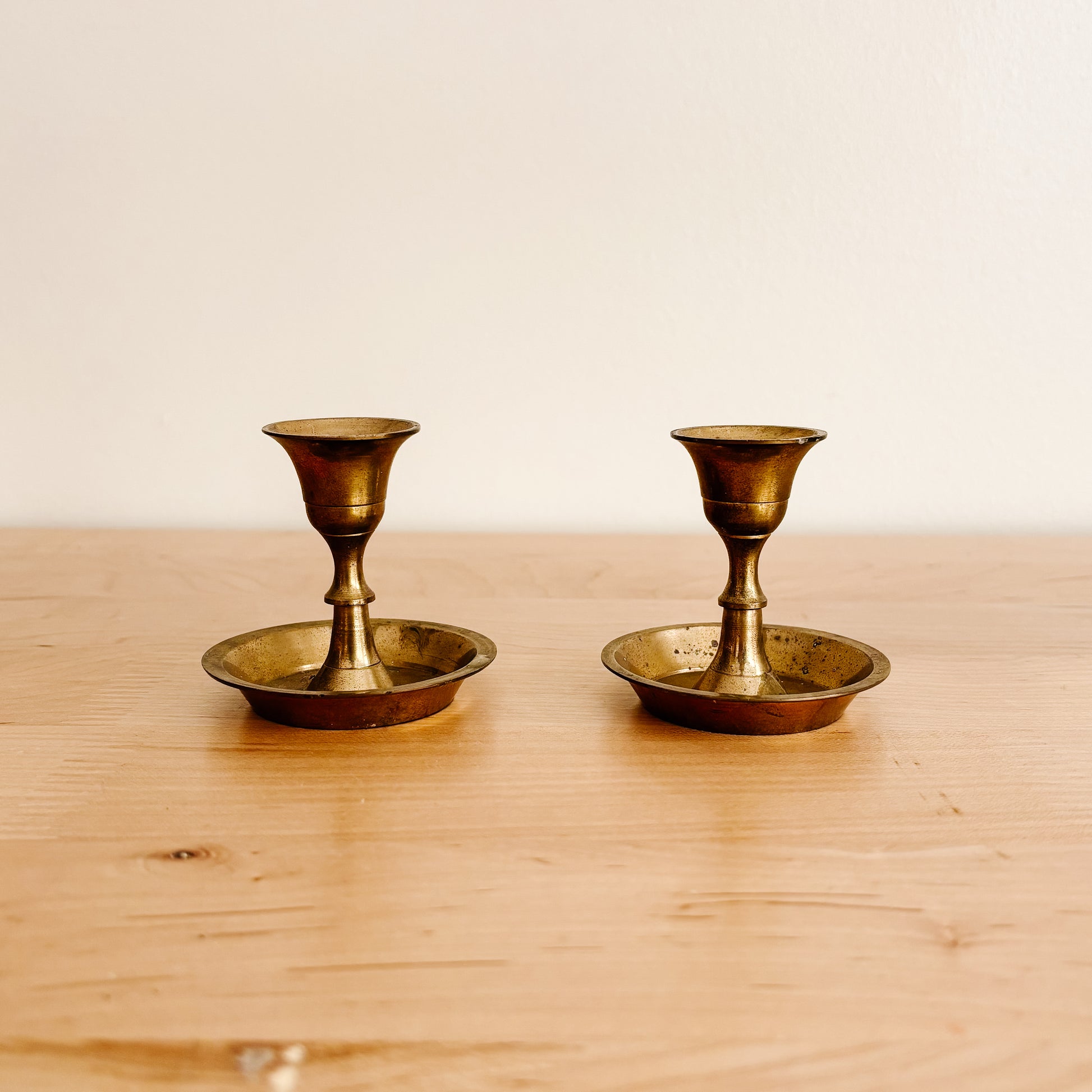 Pair of vintage brass taper candle holders with drip catcher bases. Original patina left as-is. Sold as a pair.