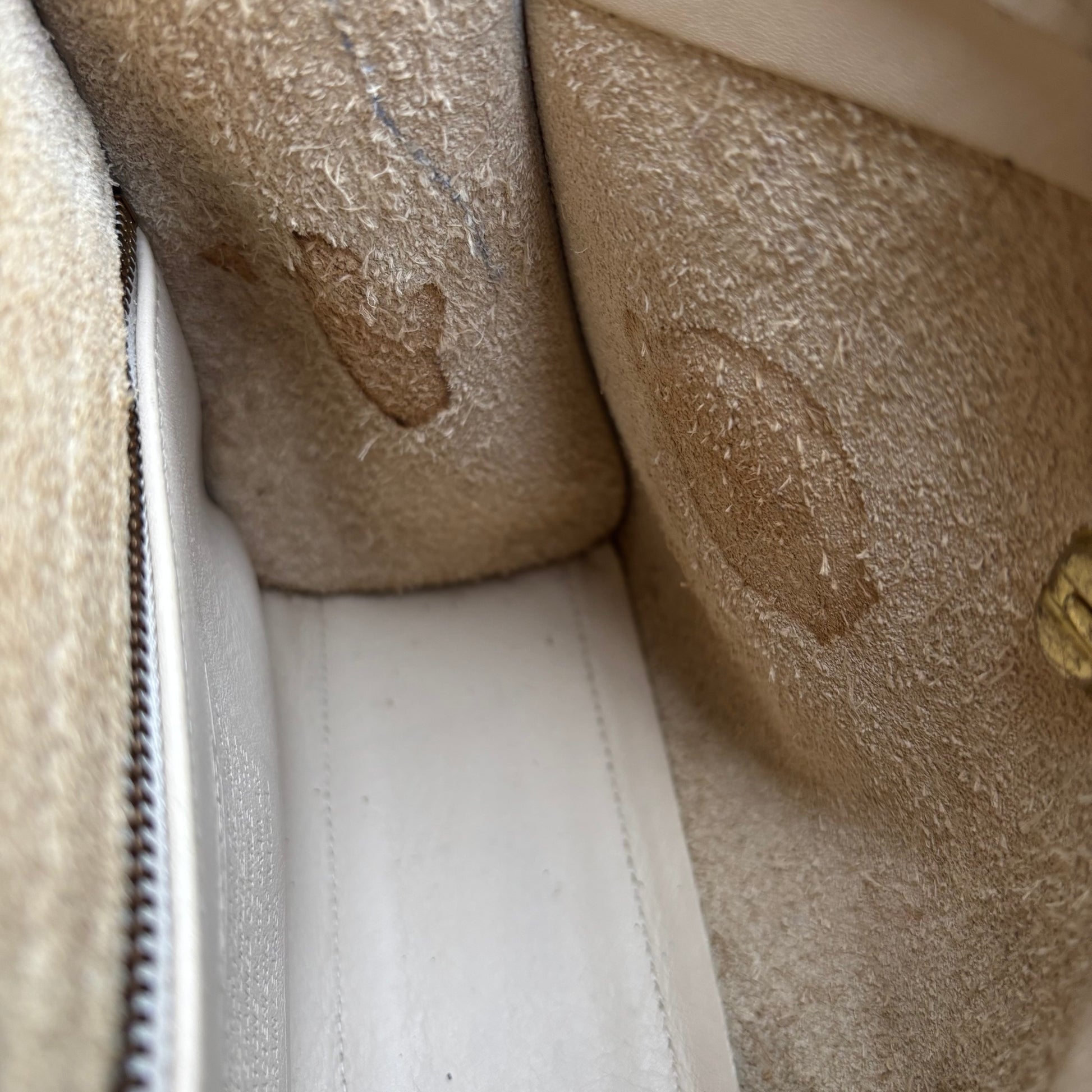 Condition Notes: Missing hang tag and shoulder strap. Exterior is in great condition with a bit of surface wear. The back has a scuff as shown. The interior is unlined and has two stains as shown. I would give this bag an 8/10 overall condition rating.
