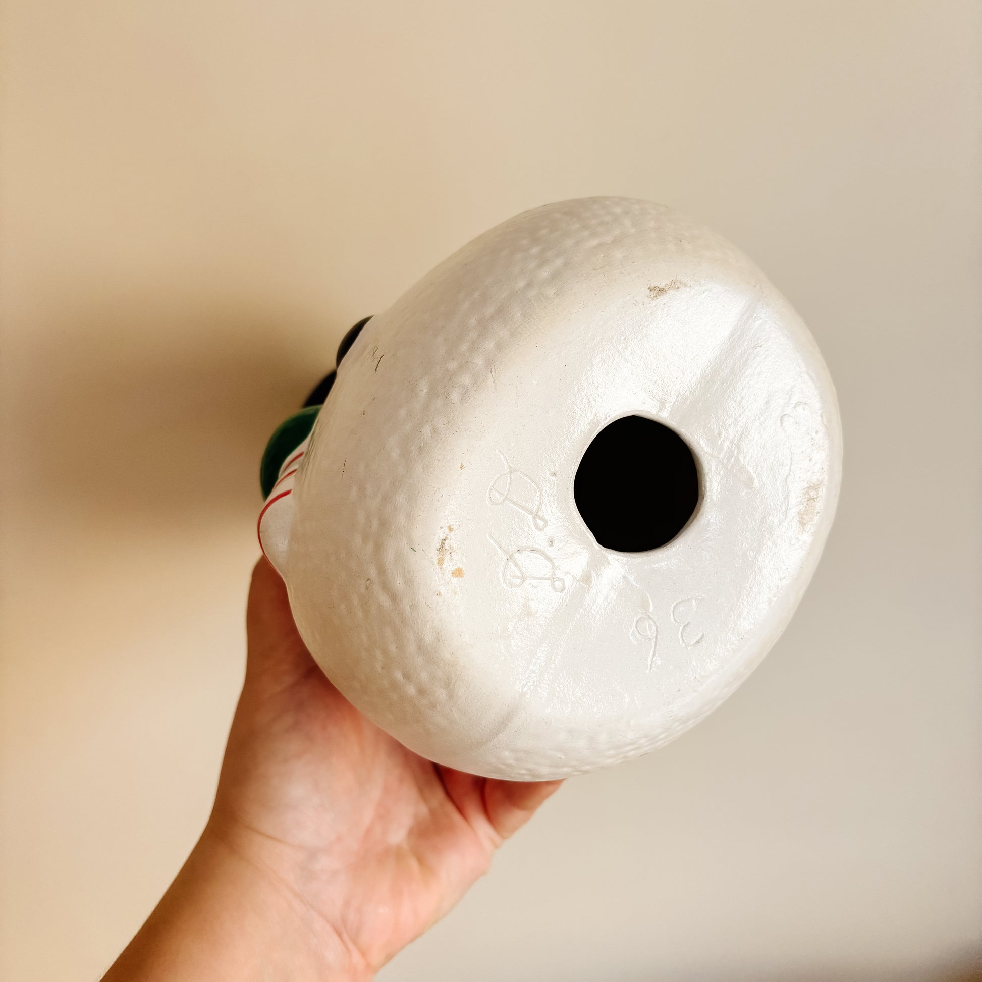 Cute ceramic snowman with a top hat, ear muffs, and a scarf! Holding a red and white candy cane. In good overall condition with a couple of scuffs near the base, see photos.
