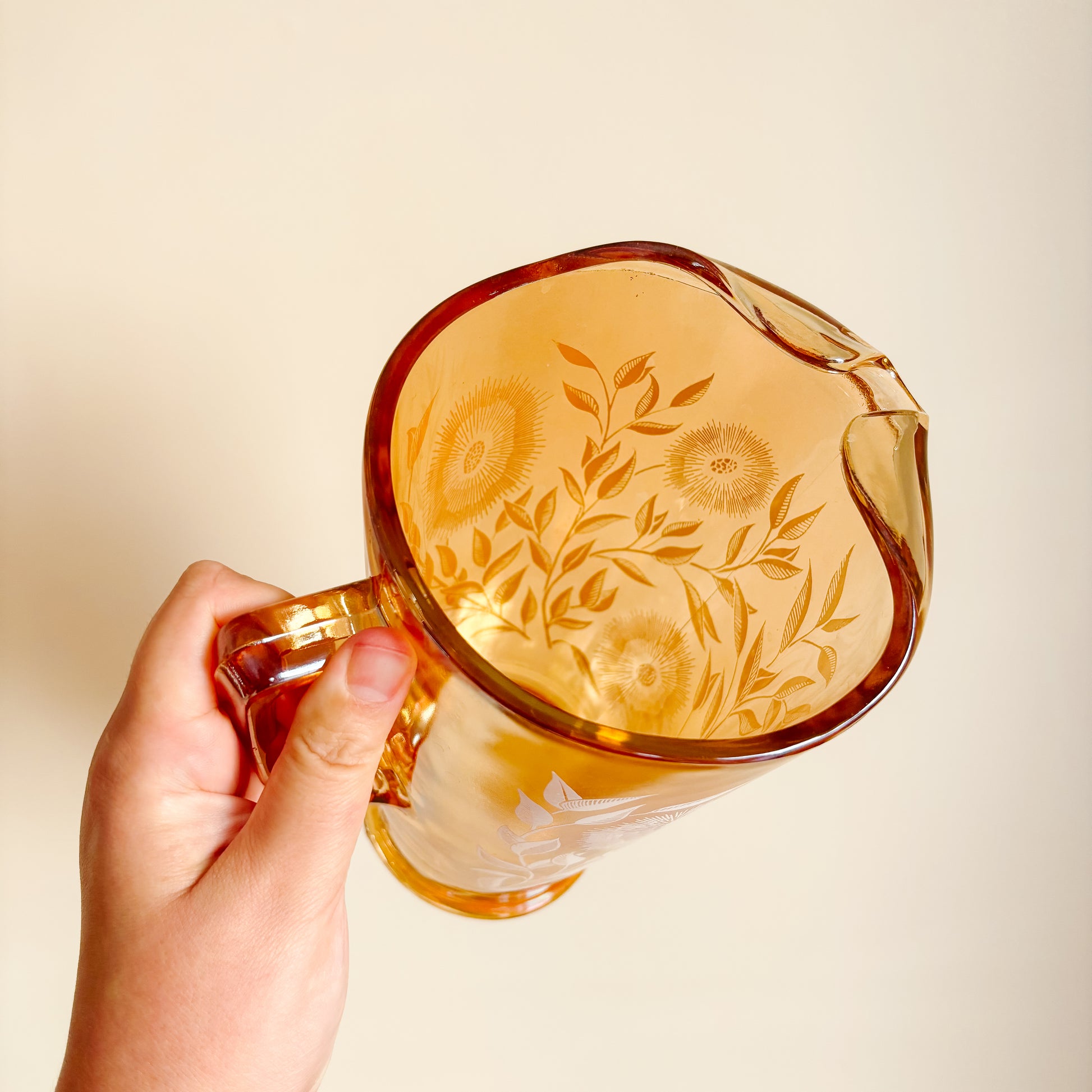 Beautiful iridescent peach carnival glass pitcher by Jeannette Glass, produced in the 1950s. Gorgeous addition to a bar setup! Super shiny with no wear on the design. No chips or damage. See all photos for details.