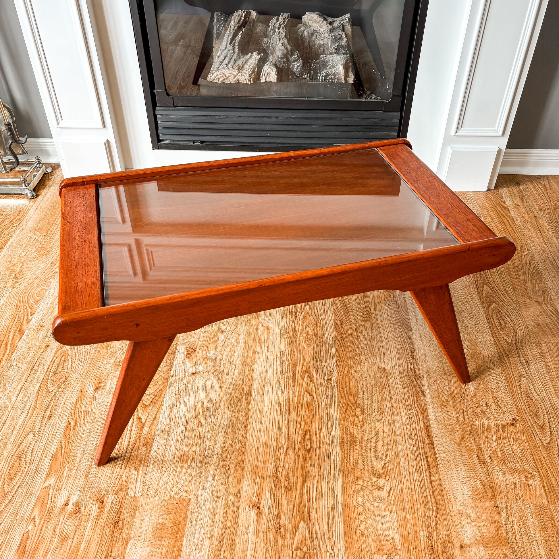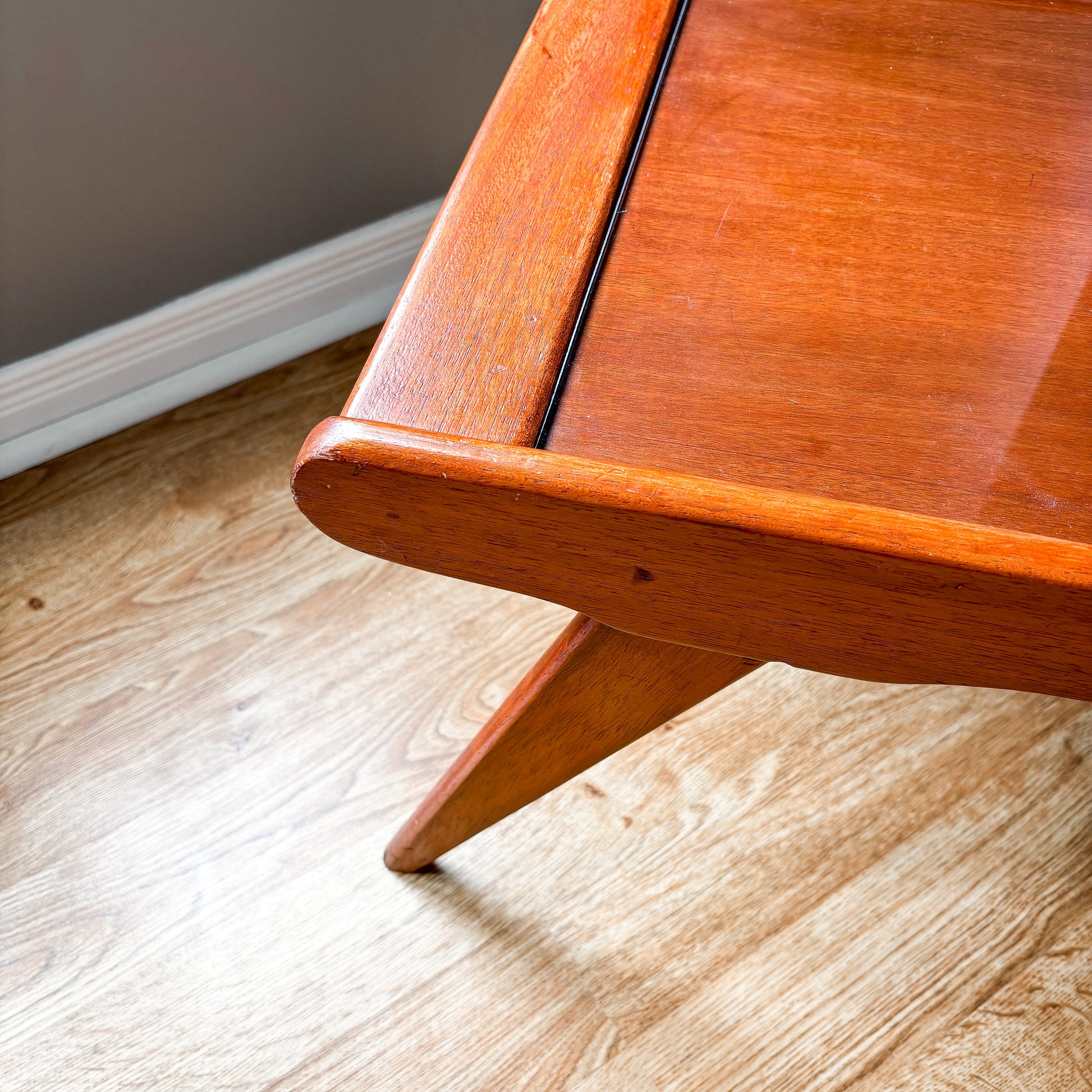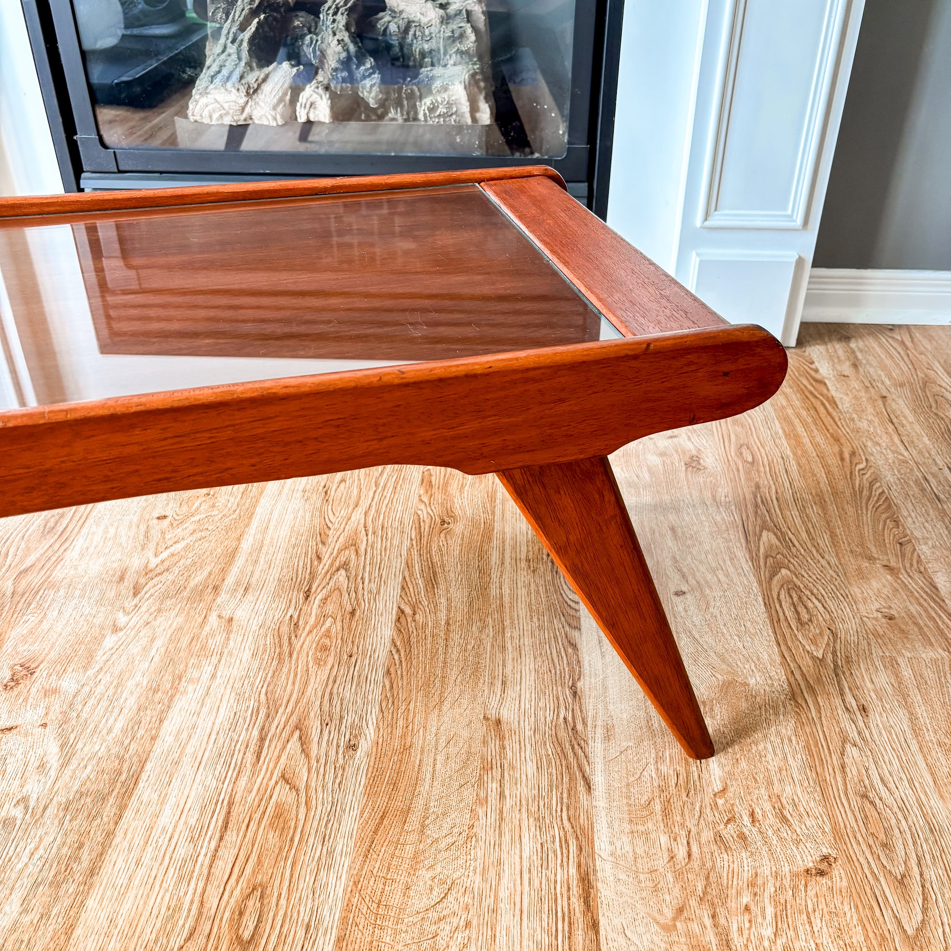 Classic MCM coffee table with a glass top insert in the middle. I love the shape of the legs and the tone of the wood!