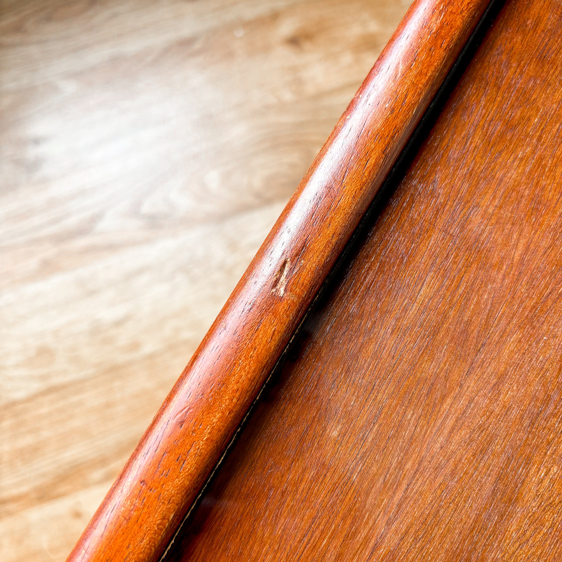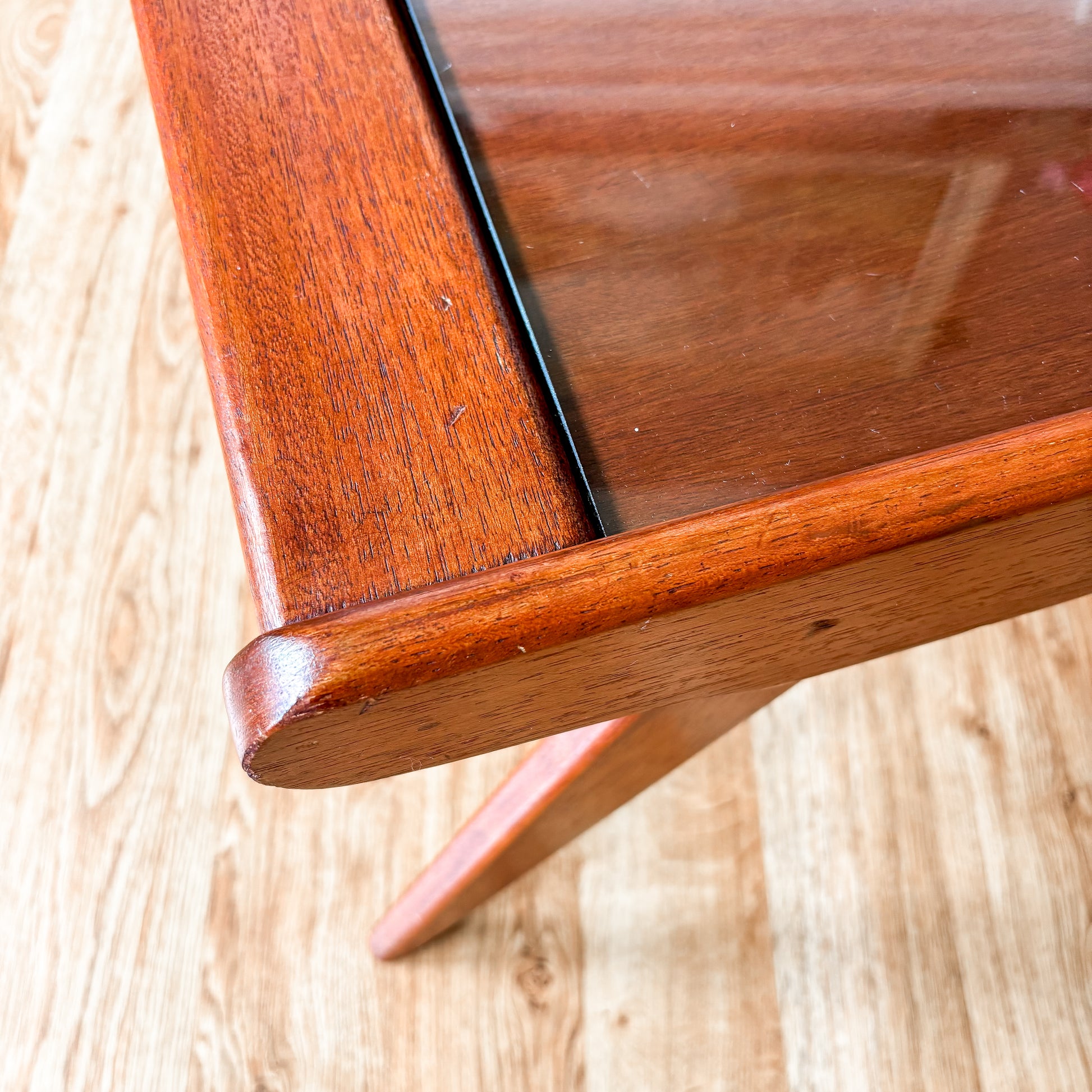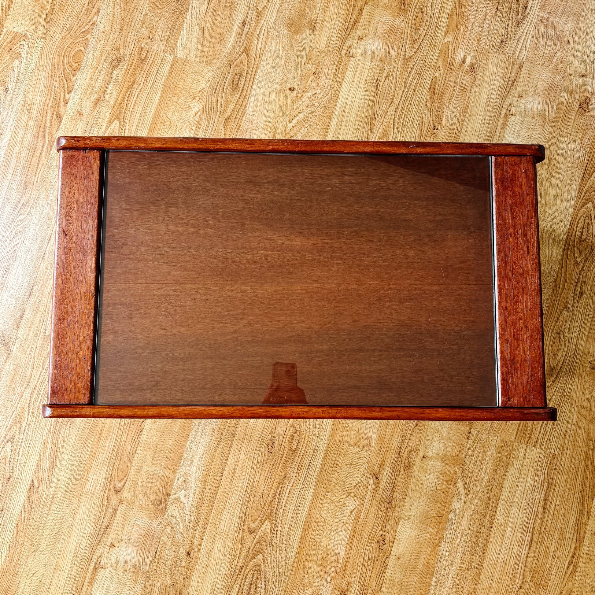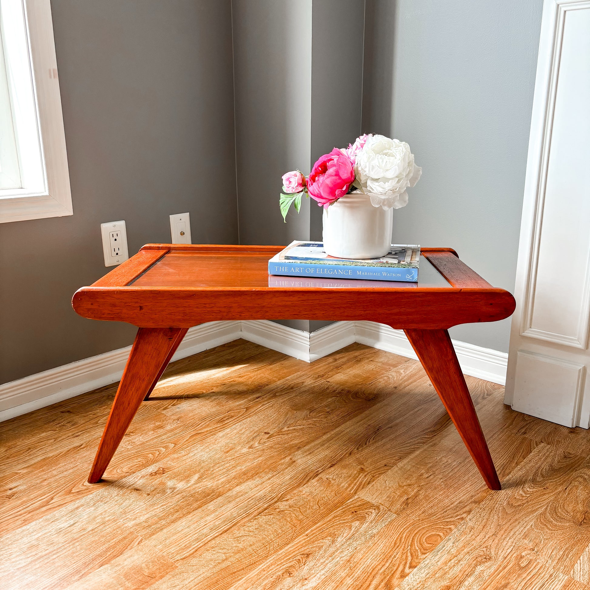 Classic MCM coffee table with a glass top insert in the middle. I love the shape of the legs and the tone of the wood!