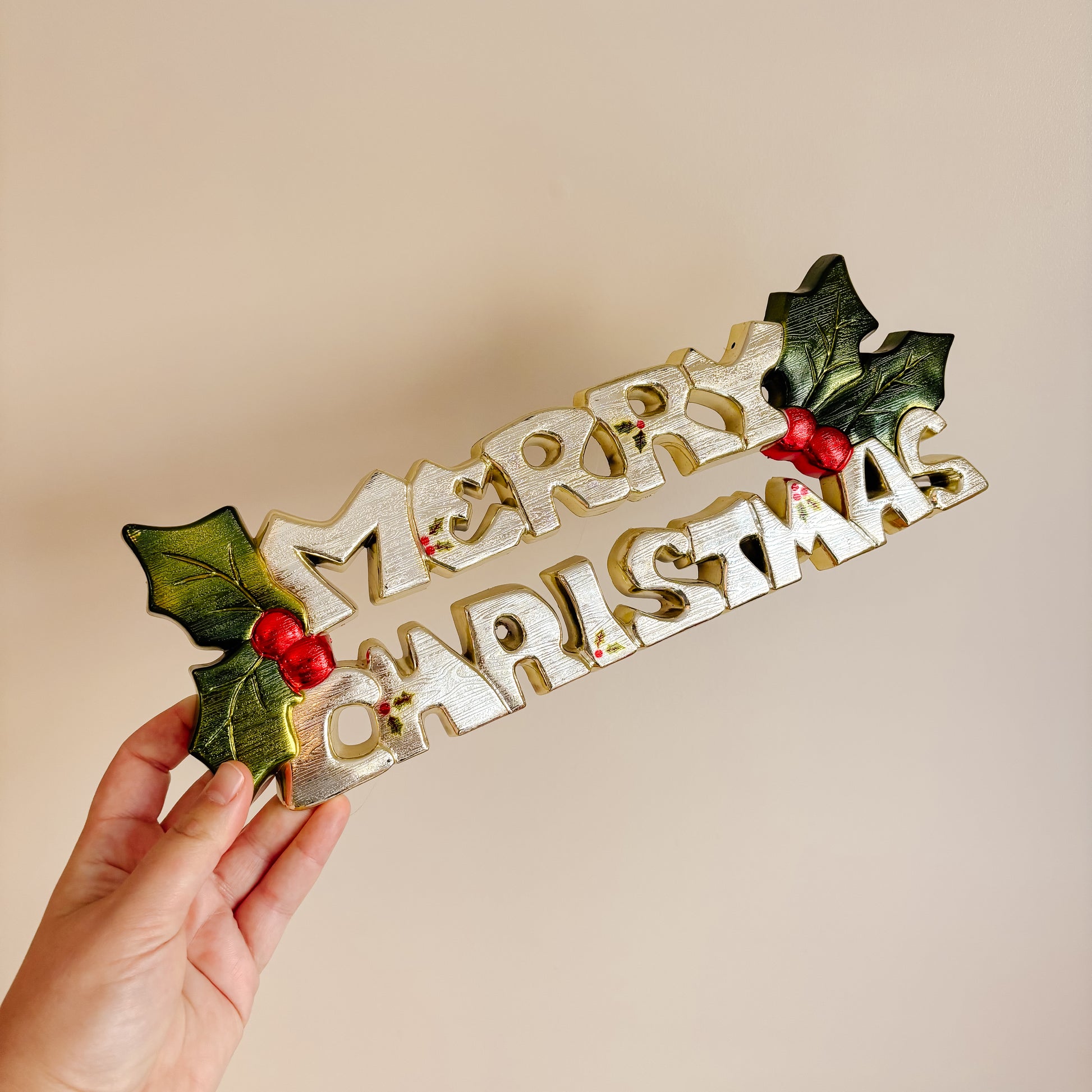 This molded plastic golden "Merry Christmas" sign has red and green holly leaves at either end. Fun vintage decor, strung with fishing wire to hang.