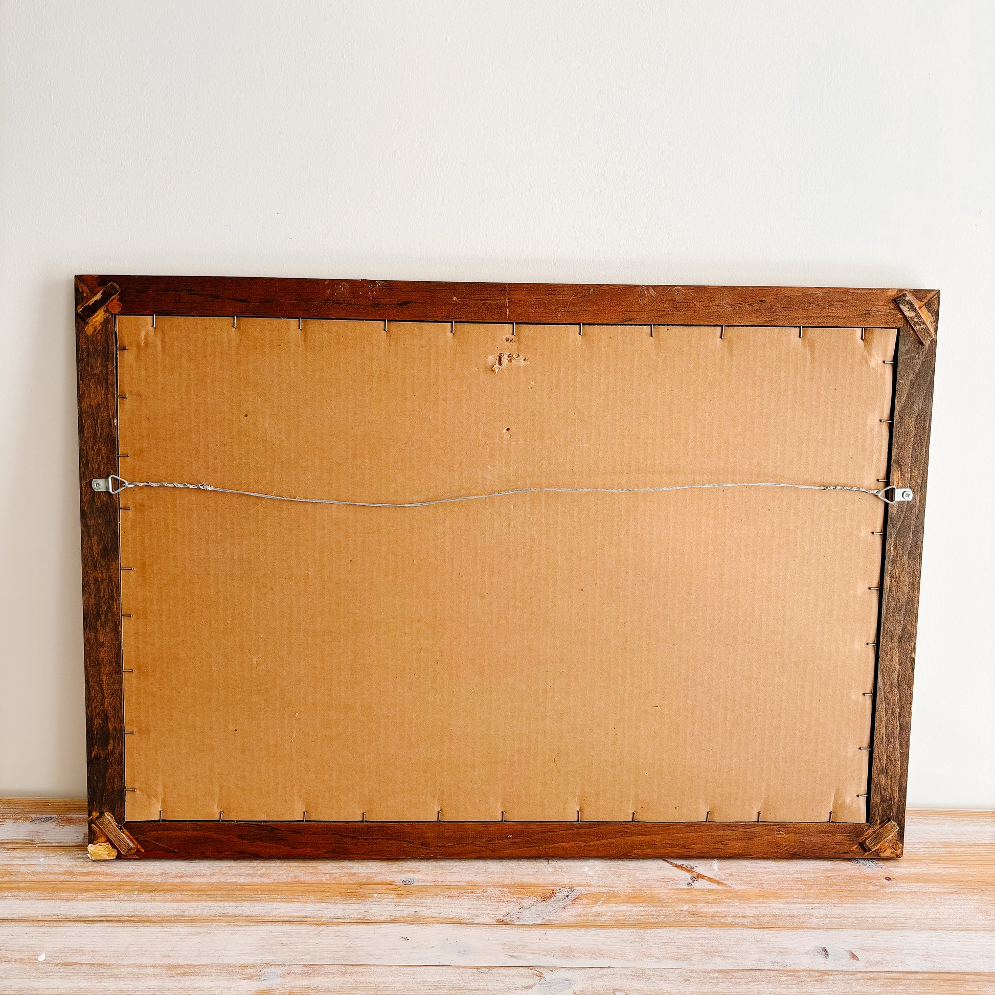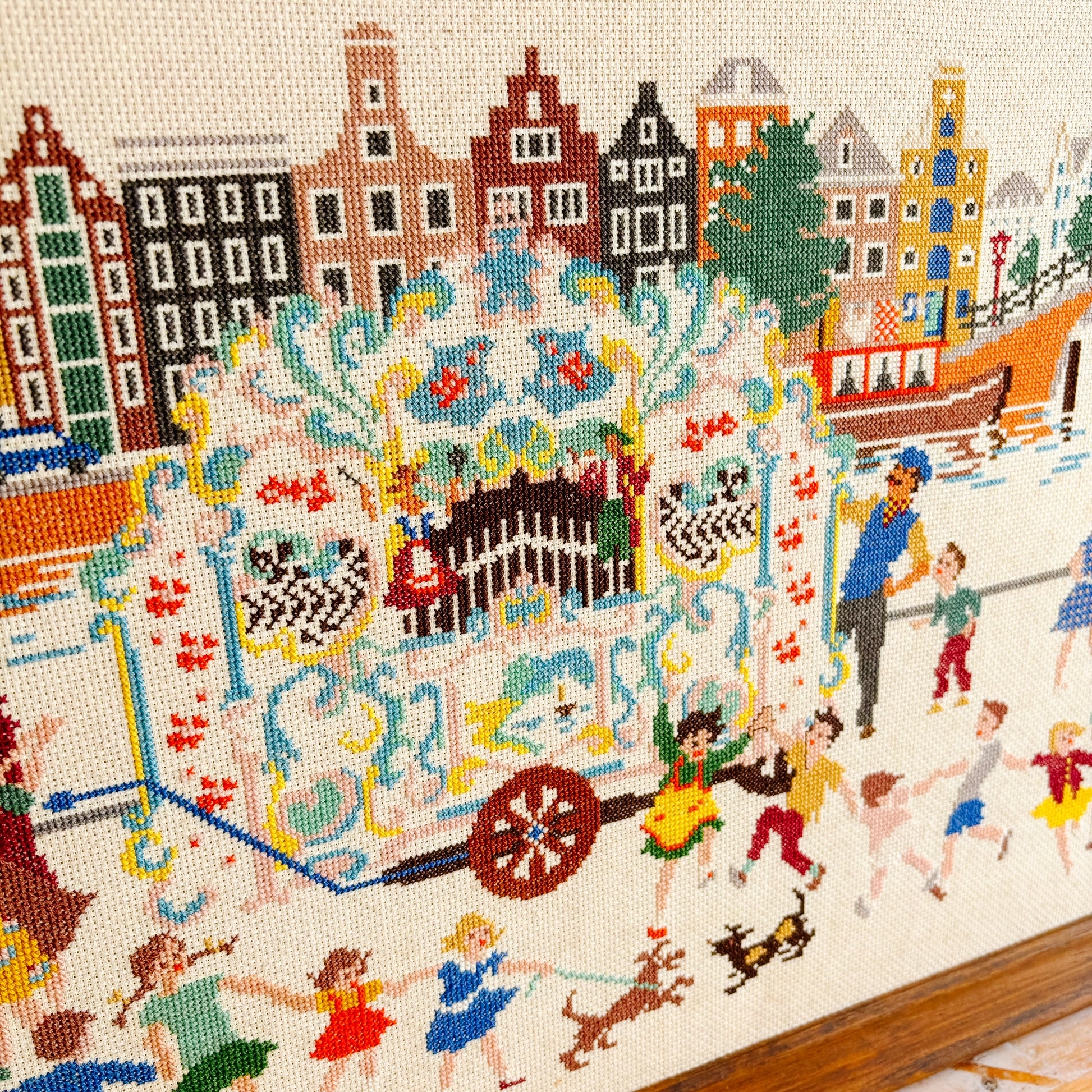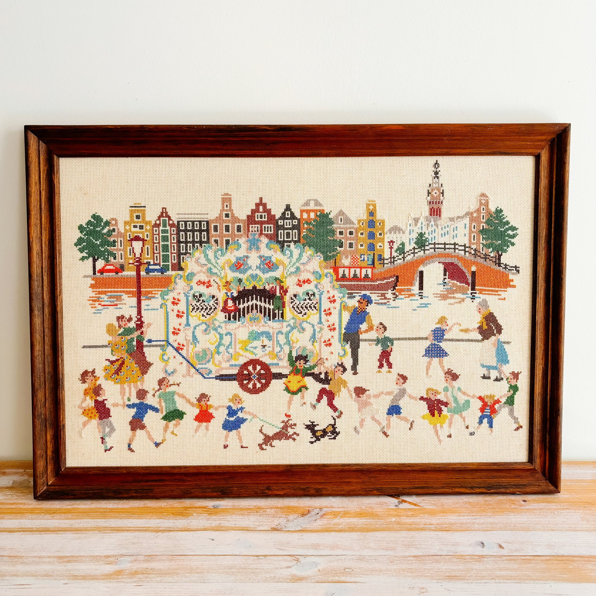 This cross stitch dates back to the 1960s and depicts a street organ surrounded by dancing children on the streets of Amsterdam. The colours are super vibrant and fun. In excellent condition, frame is wired to hang.